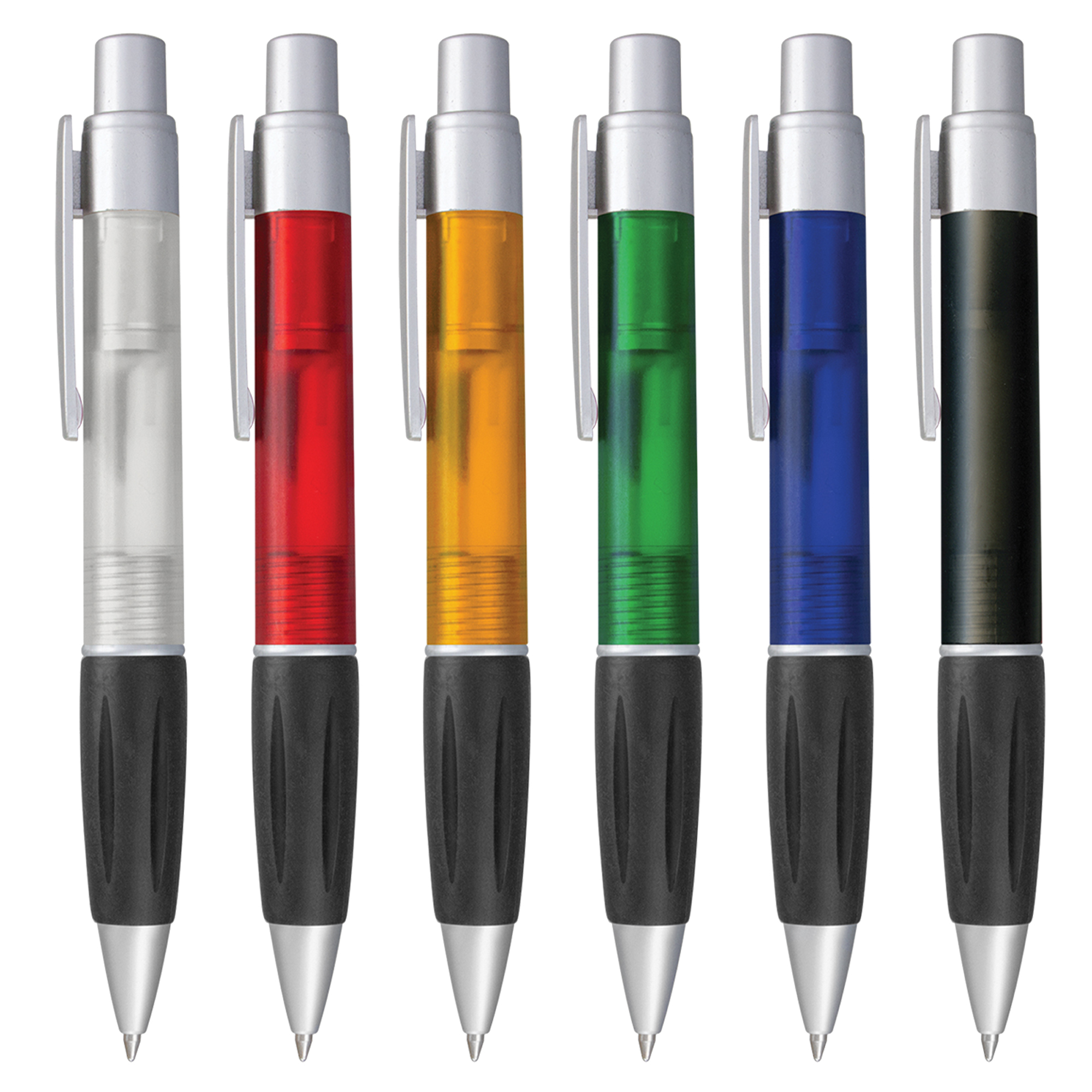 Click action pen with rubber grip. High quality Germany black ink refill. Tungsten carbide ball
