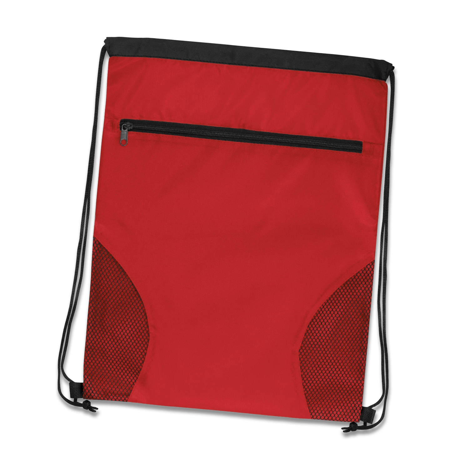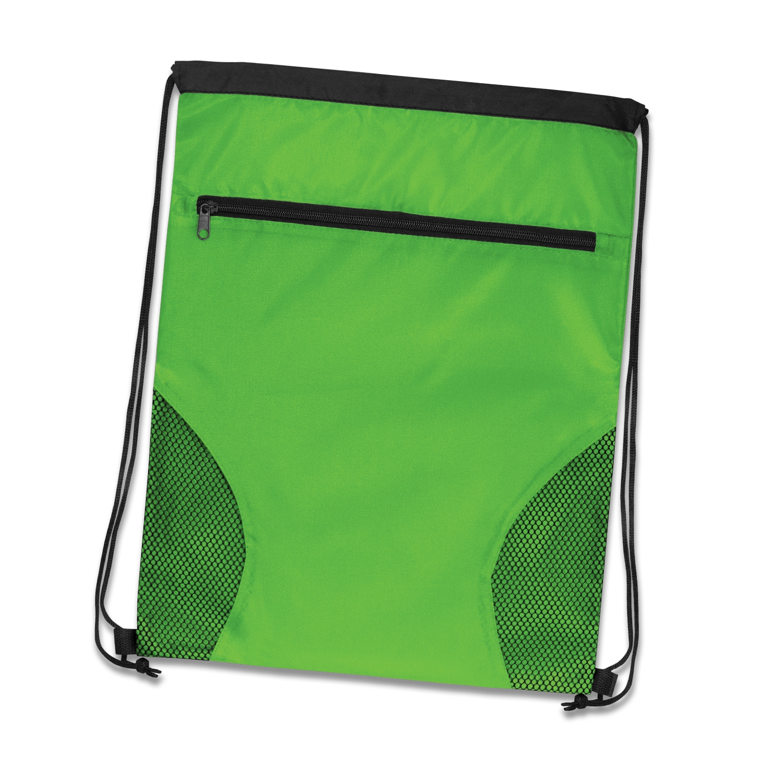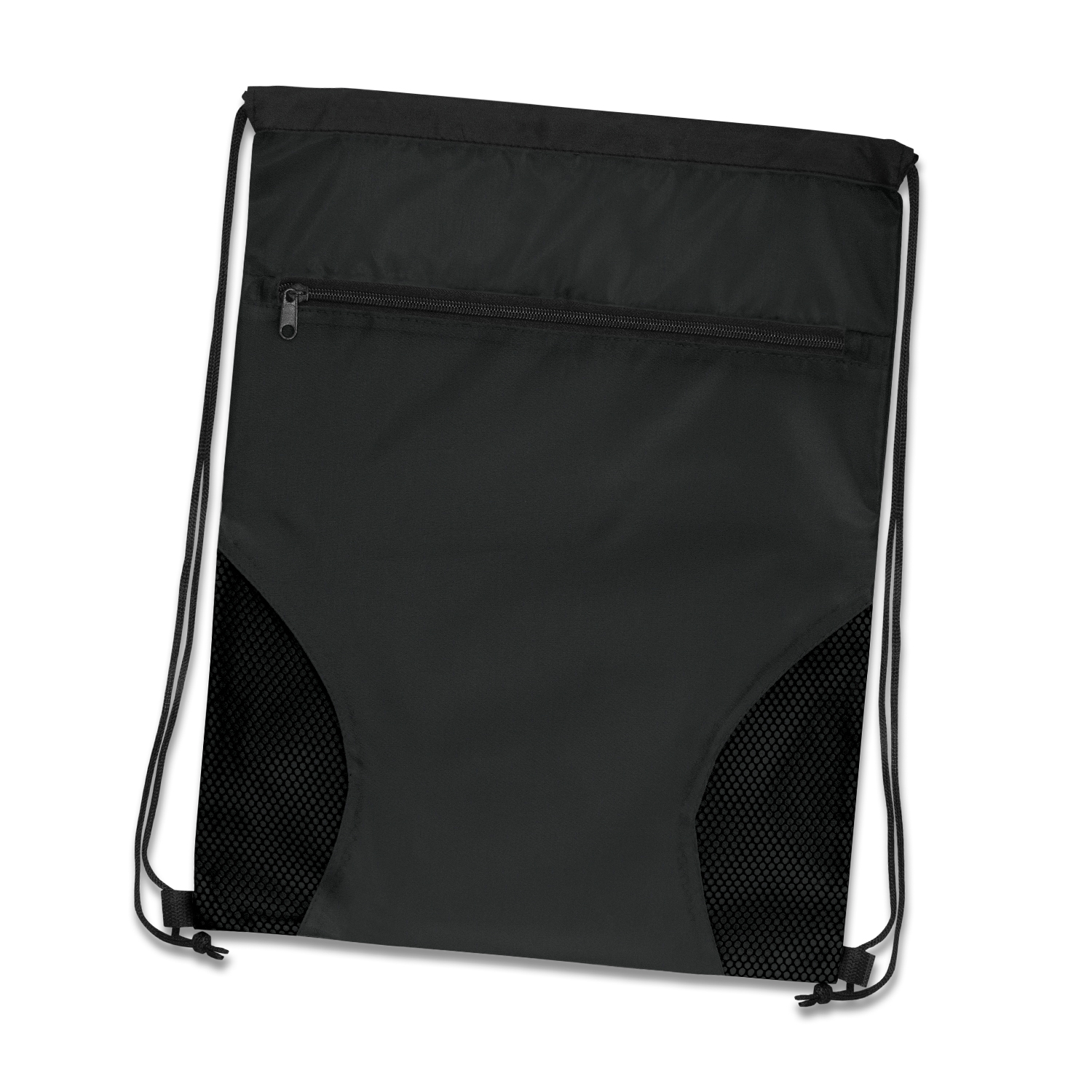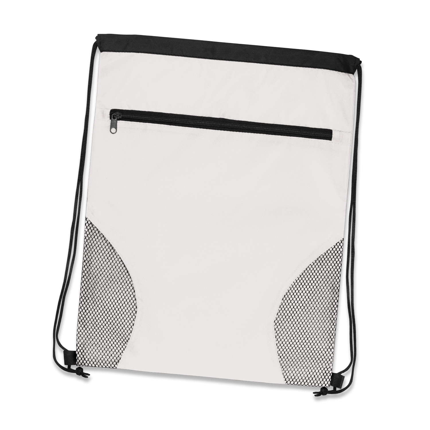 Stylish drawstring backpack with decorative mesh accents and a large zippered external pocket. It is manufactured from 210D polyester with robust braided loops at the base to secure the drawstrings.