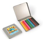 Set of 12 assorted coloured, half size, sharpened pencils in hinged tin.