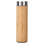 Elegant slim design 500ml stainless steel vacuum double wall drink bottle with filter, featuring an eco-friendly sustainably sourced natural bamboo outer wall. It has a touch LED temperature display lid, it is leak-proof and can keep hot for at least 4hrs-8hrs and cold for 24hrs. The inner wall is 304 food grade stainless steel and BPA FREE. It is not dishwasher and microwave safe, handwashing is recommended. Do not place dry ice, carbonated drinks etc inside the bottle. The natural bamboo does produce variances in colour, grain pattern and branding. This bottle is small enough to carry around, they can fit into totes, bag packs, and most car cup holders, it has large capacity, suitable for carrying a variety of coffee, hot water and ice water to meet your daily drinking needs, is a great promotional product to display your logo and get your message across.
