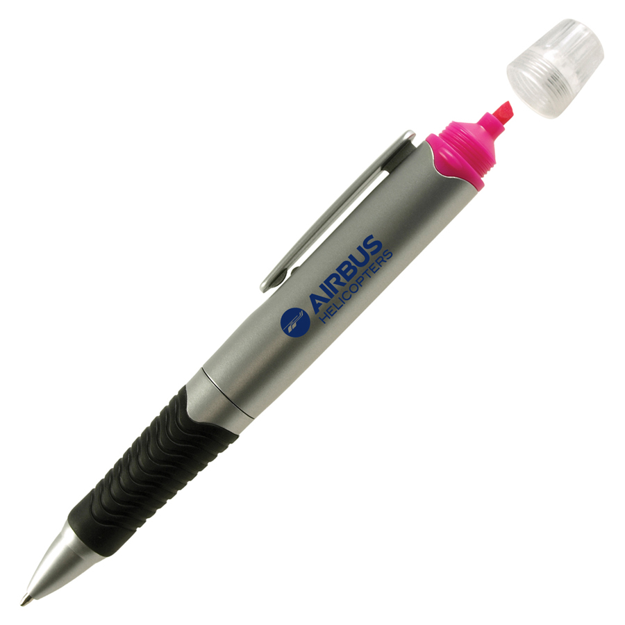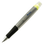 Twist action pen and screw top highlighter with wide silver barrel and black rubber grip. Black German ink refill with 2,000m writing distance.