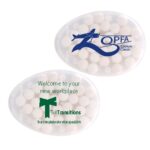Oval mint dispenser with snap lock opening. Contains approximately 30 sugar free mints. Materials: Plastic