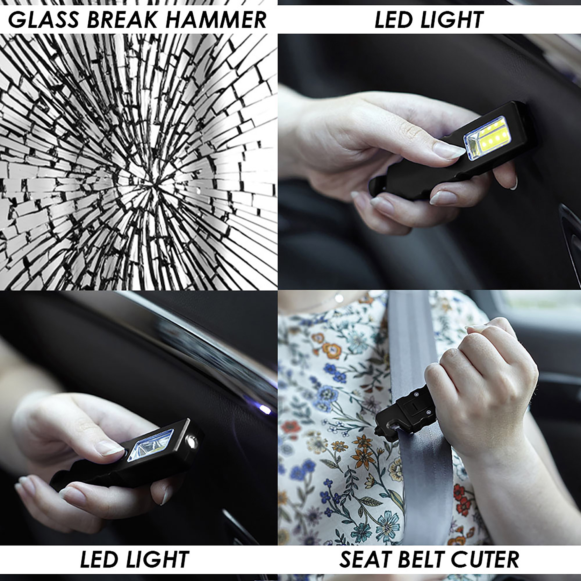 This is a handy life saving tool and must be kept in the car, it features an emergency glass breaker(a high quality & long lasting durable material), seat belt cutter(sharp razor blade made of high quality stainless steel), an emergency flash light and front end torch. It also has a magnetic button to attach to steel metal objects. A great portable and easy to use promotional product.