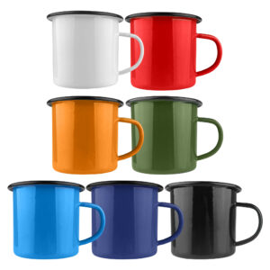 Durable 350ml Enamel Camper Mug with glossy colour outer, white colour inner and black on top edge. It is made of stainless steel and stylish enamel. The perfect mug for your next camping adventure. This mug is BPA free and not dishwasher safe, handwashing is recommended.
