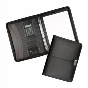 Black bonded leather with brushed silver badge, 3 x 20mm removable snap rings, A4 notepad, pen loop and business card pockets. Optional dual powered calculator D980. Supplied in black box.