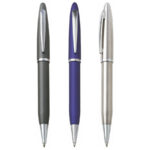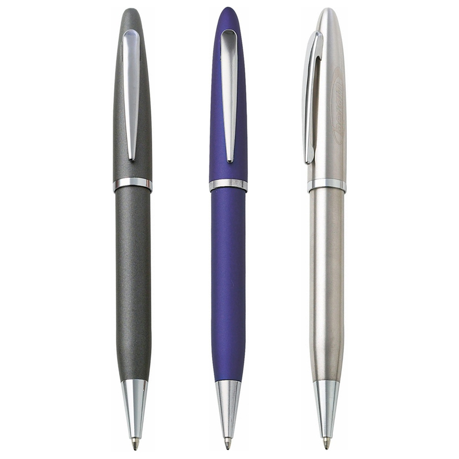 Twist action matt coloured barrel with gloss silver trim. Black ink refill.