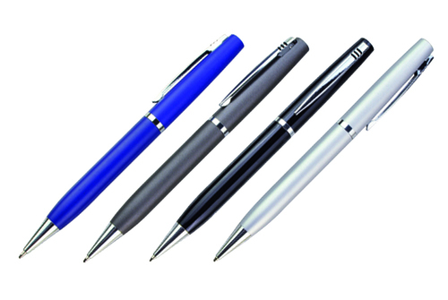 Twist action pen. Coloured barrel with gloss silver fittings. Metal Cross-type black ink refill