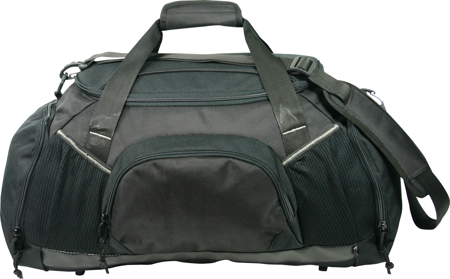 Sports bag with heavy duty 1680D nylon colour trim and 600D nylon body, multiple pockets, two mesh bottle holders, adjustable/removable shoulder strap and base board.
