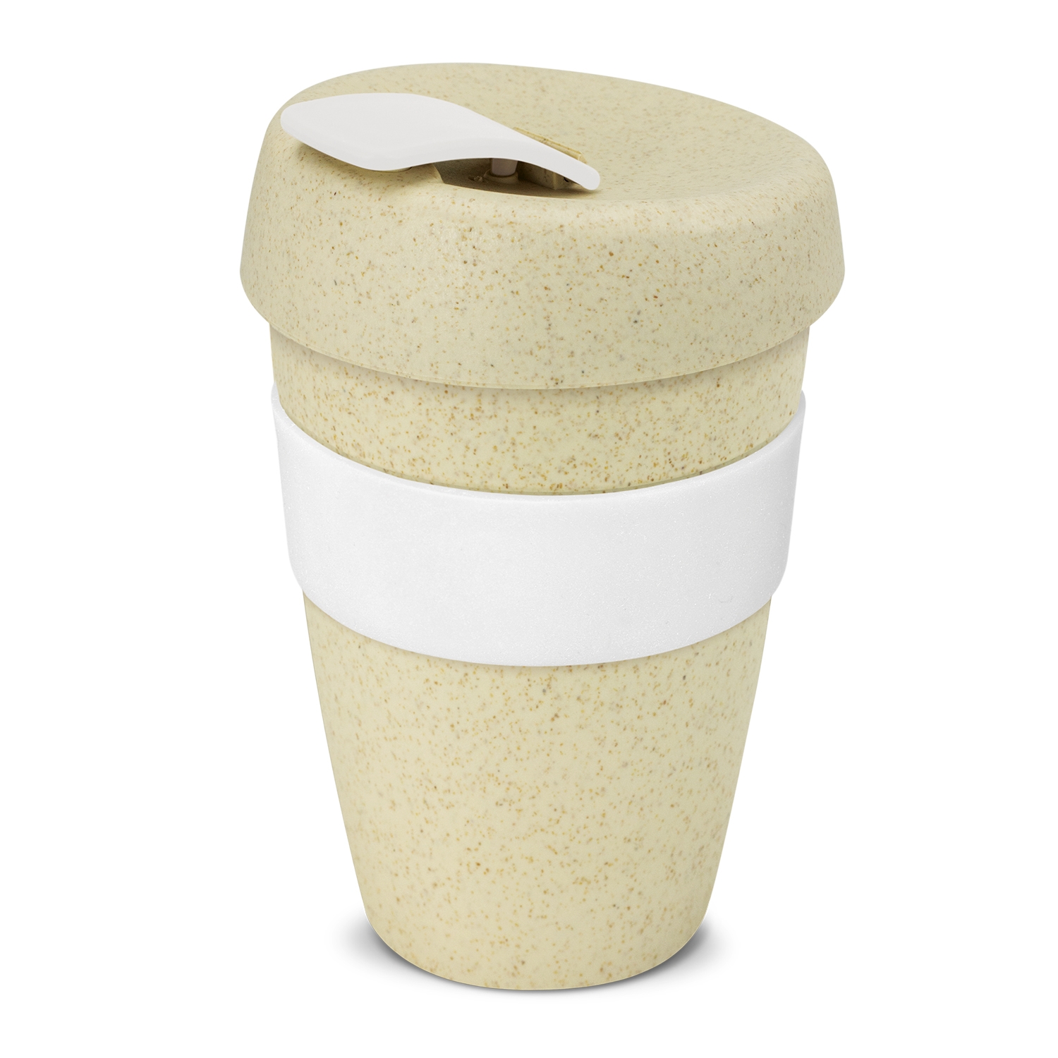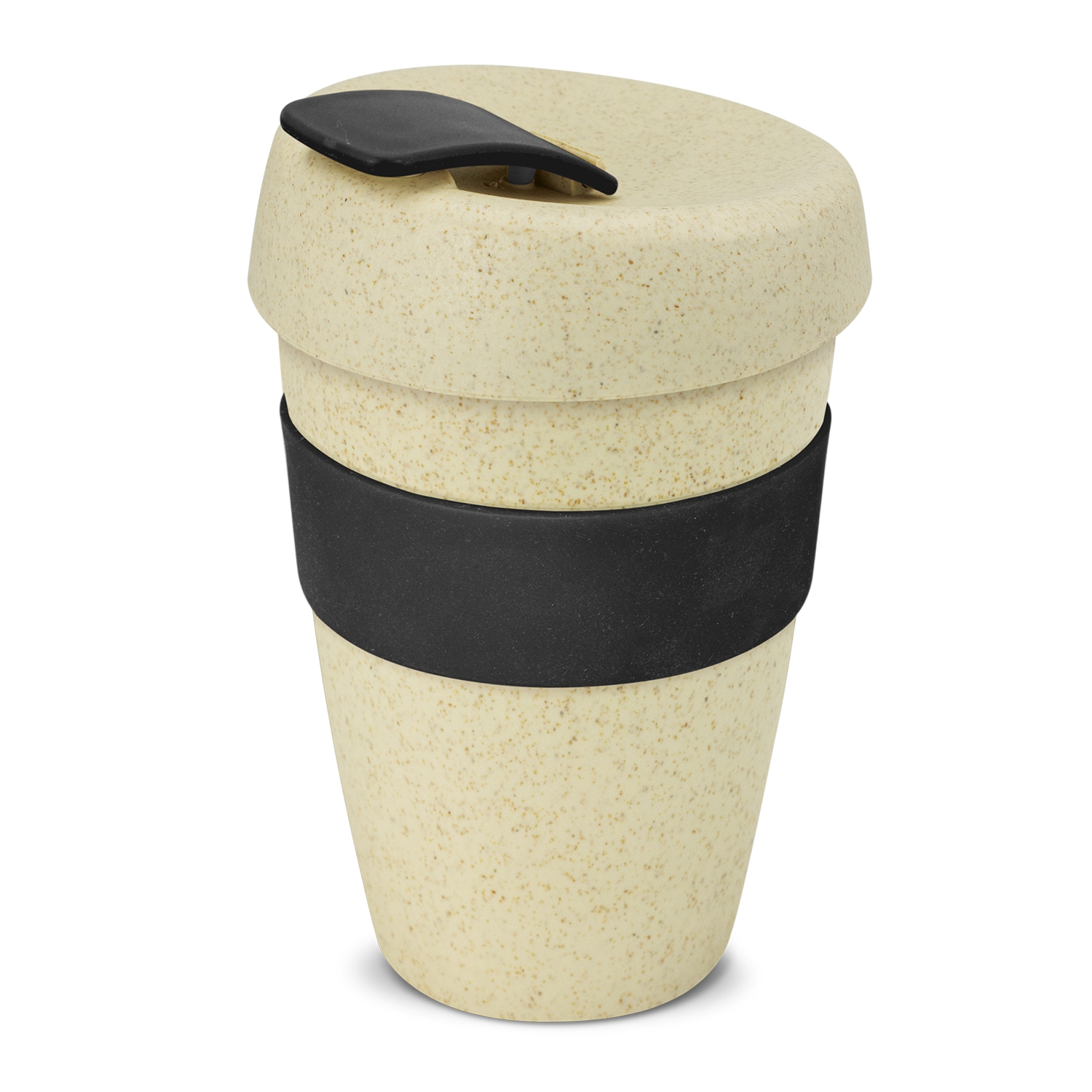 Unique 340ml double wall reusable coffee cup which will keep drinks hot for longer and remain comfortable to hold. It is manufactured from a 50/50 blend of natural rice husk fibre and BPA-free polypropylene. Rice husk is a waste product with little value and the agricultural industry often dispose of it by burning which creates air pollution. Using it to make a reusable coffee cup reduces the amount of plastic and produces a trendy natural look. It has a decorative silicone band and a secure screw on lid with a splashproof flip closure. The silicone band and flip closure can be mixed and matched in any colour combination from the standard colours at no extra cost. Up to five different colour combinations are included in the price and more are available for an additional charge. An optional black gift box is available on request. This product is not dishwasher safe and handwashing is recommended. Express Cup Natura is protected under New Zealand Design Registration No. 419451 and Australian Design Registration No. 361937.