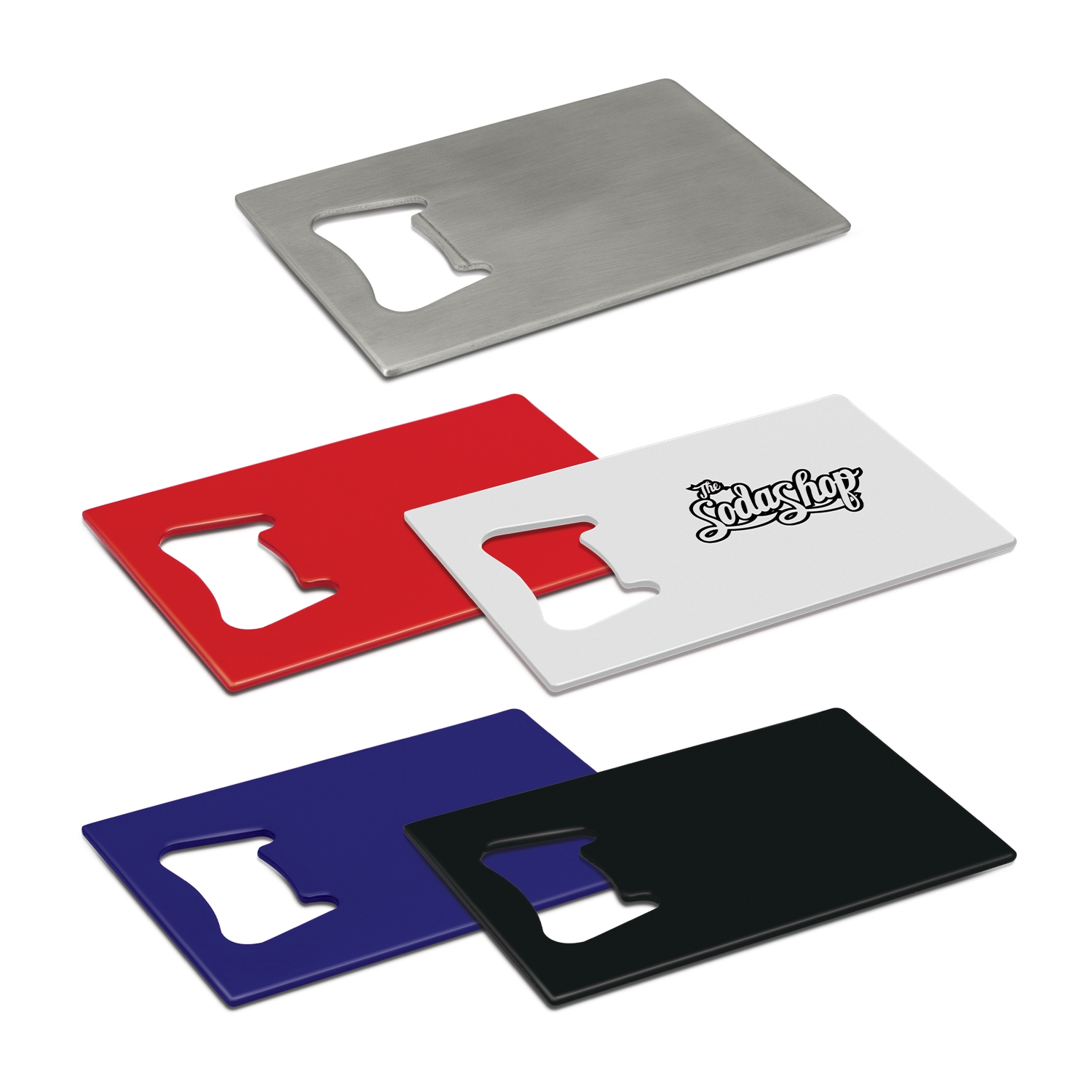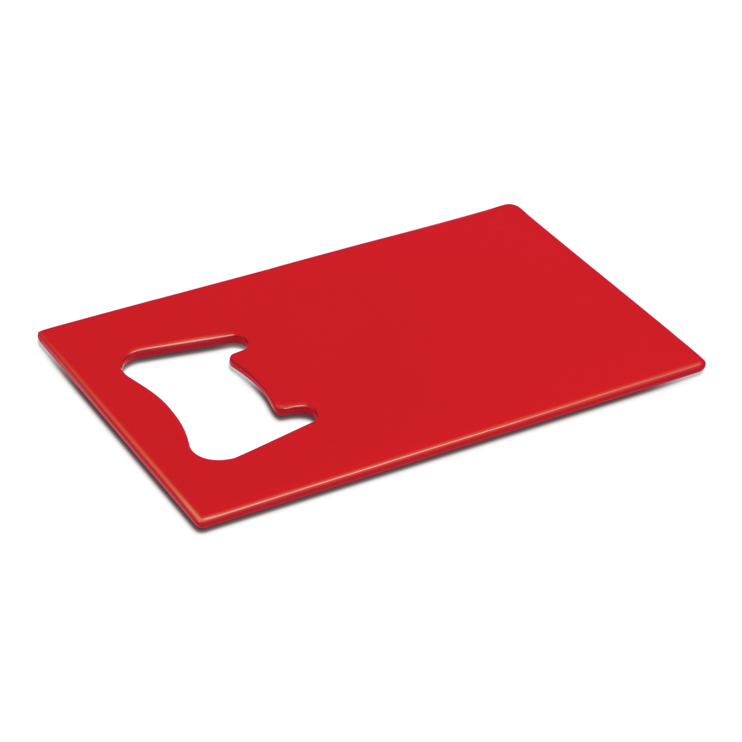 Credit card shaped stainless steel bottle opener with a large branding area. . Decoration options: Pad Print | Laser Engraving