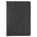 A5 soft-touch PU leather notebook with built-in black pen sleeve on the front cover. 80 lined off-white pages with black elastic closure and matching colour fabric bookmark.