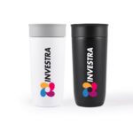 360ml double-walled stainless steel vacuum cup. Secure screw lid & push button feature which allows drinking from any position on the rim. Drinks will remain hot/cold for up to 6 hours. Slim design and suitable for car cup holders. BPA free. For logo longevity hand washing is recommended. Not suitable for carbonated liquids or freezing. Eco Credentials: Reusable, sustainable, printed using renewable energy.