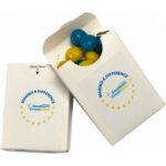 Flip Lid Cardboard Box filled with 25g Chewy Fruit PLASTIC FREE - TAMPER SEAL BOX - RESEALABLE BOX - RECYCLABLE BOX LARGE BRANDING AREA allows for branding on the front & back of box Colours Chewy Fruit: Any mix of White, Blue, Green, Red, Yellow & Orange Flavours: White - Mint, Blue - Passionfruit, Green - Apple, Red - Strawberry, Yellow - Pineapple & Orange - Orange Best before: 12 months