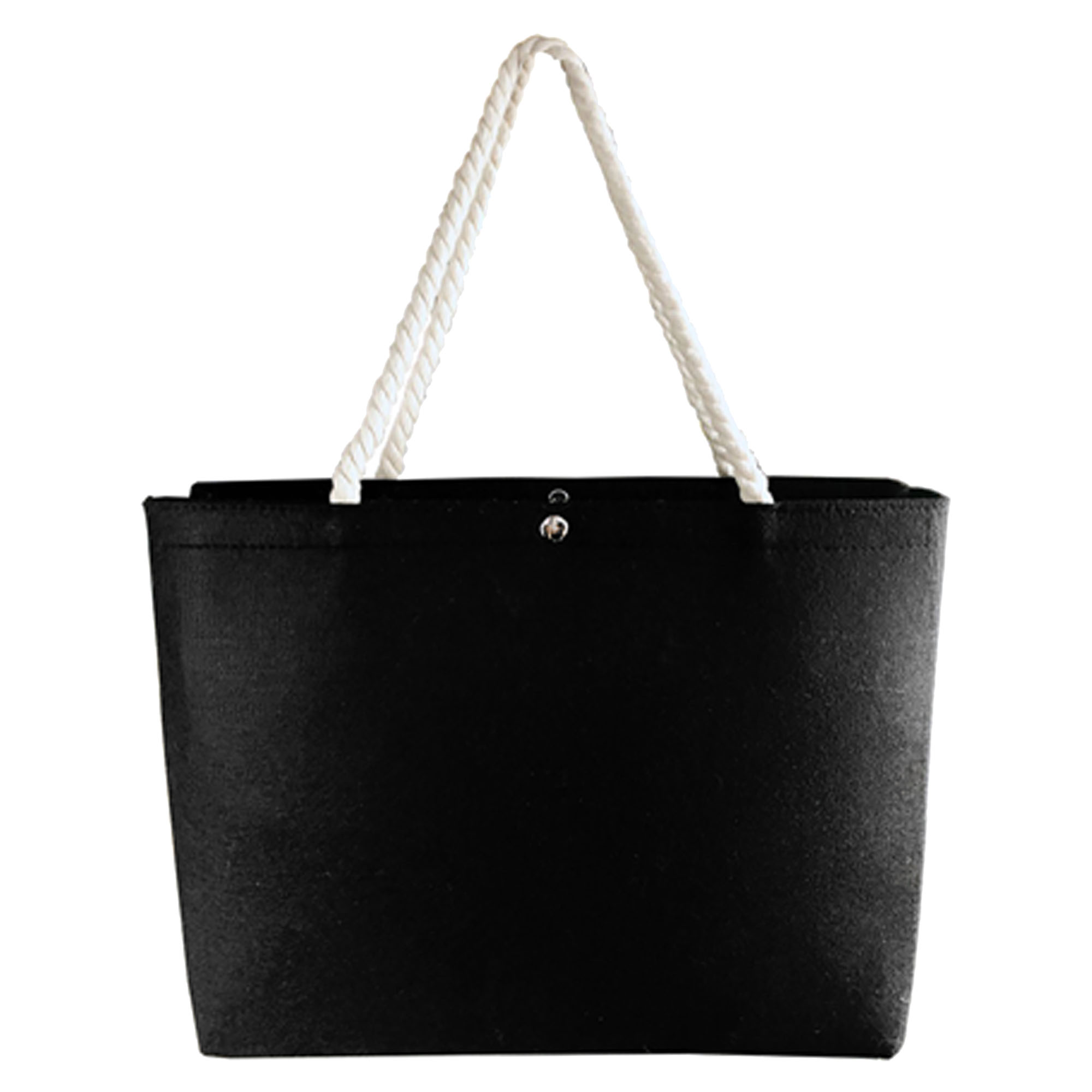 A fashion shopping bag is made of 3mm thick quality black felt fabric, which is a durable, moisture-repellent and heat-insulating material. Smart design comes with 2 comfortable thick rope shape handles and a top botton closure. A great promotional bag for corporate events.