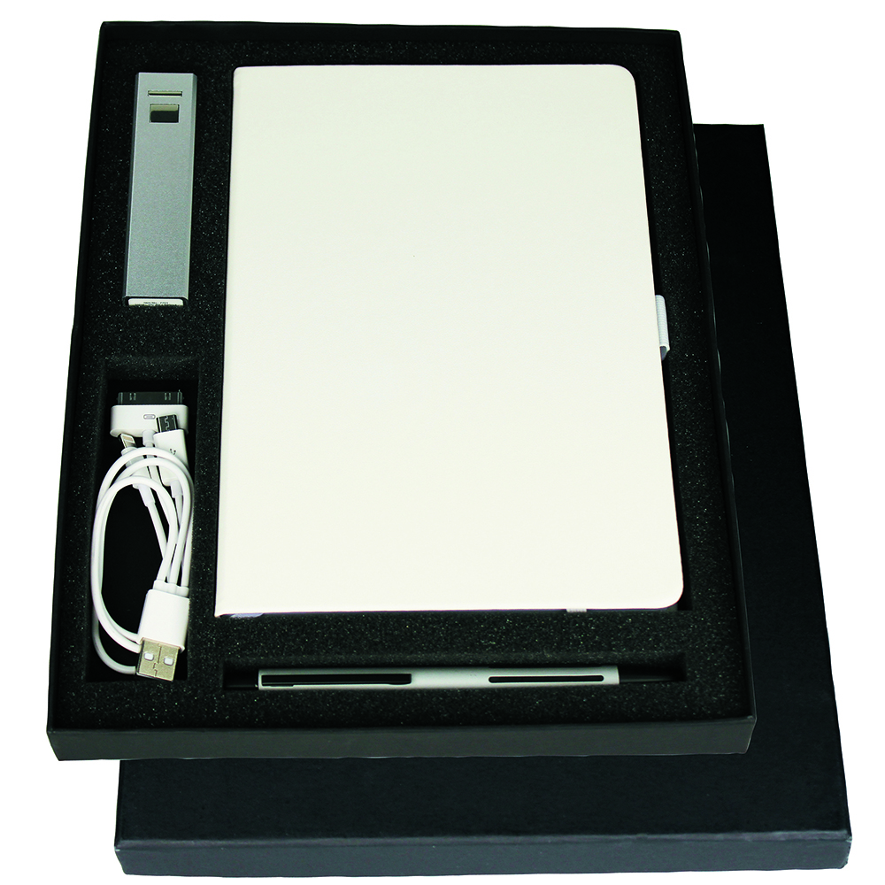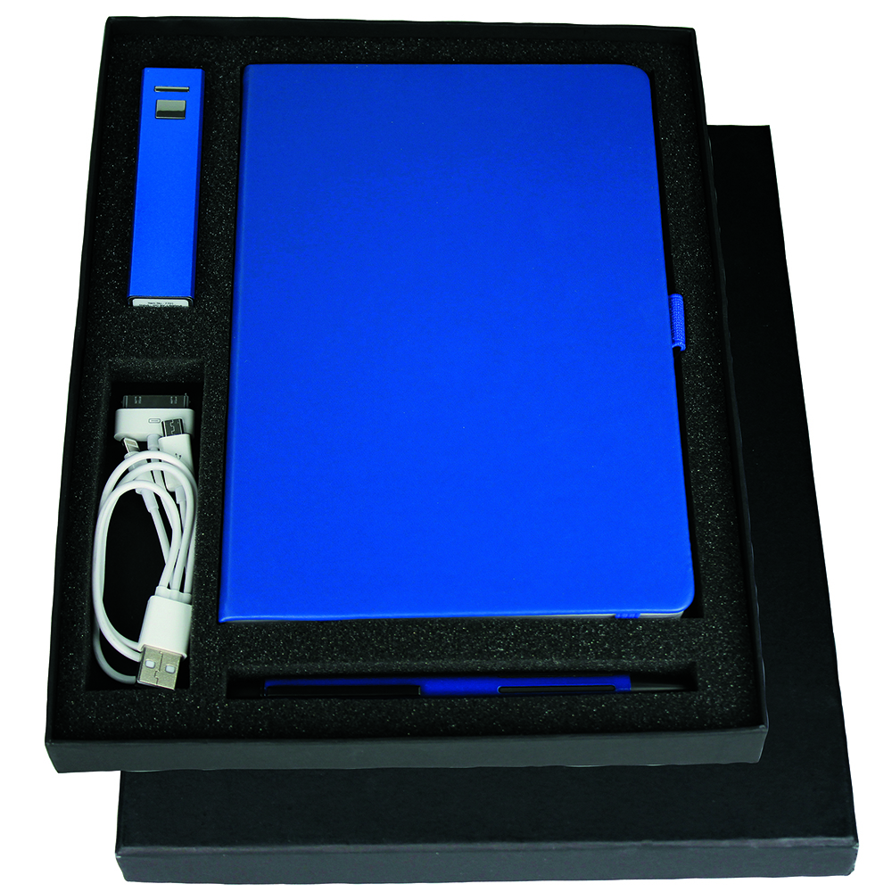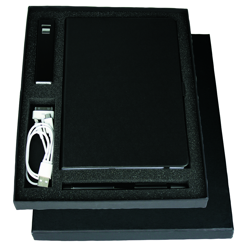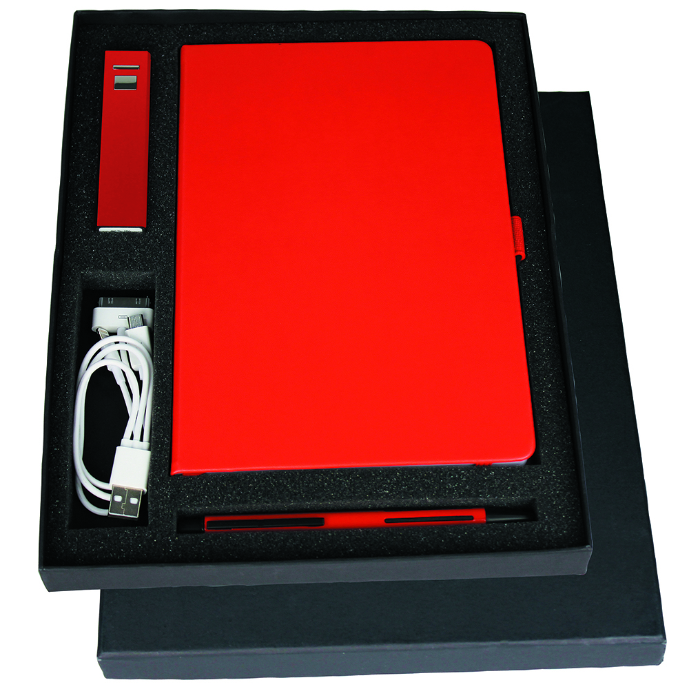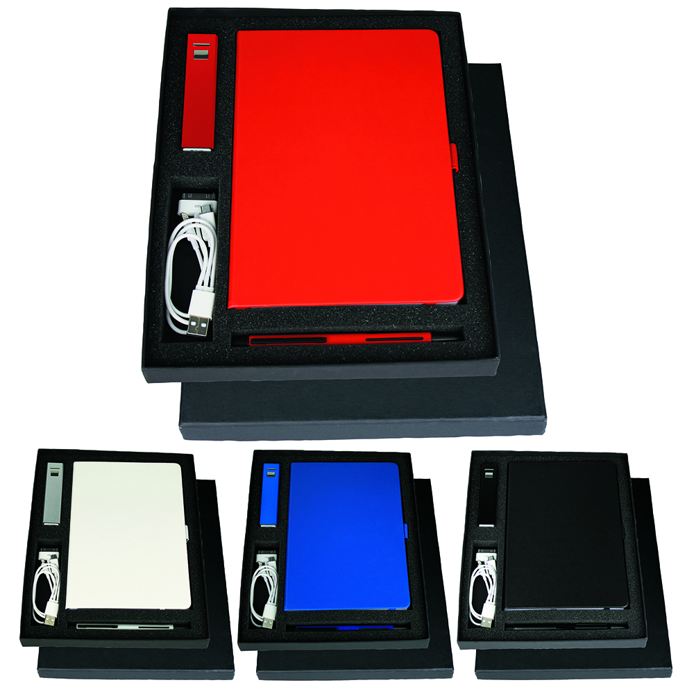 This gift set consists of a Nova Bound JournalBook, a Jolt Charger and a Danley Pen. Each item is available in Black, Blue, Red and Silver and can be purchased as a set or as individual items. When purchased as a set they are presented in a custom made 2 piece gift box with foam insert for the presentation of each item. The Nova Bound JournalBook features a satin ribbon bookmark, elastic privacy closure, expandable accordion pocket paper pocket in back, pen loop and thread-sewn book binding. The Jolt Charger features a 5V/1A USB output that charges at the same rate of most wall chargers. It has a 2,200 mAh internal battery with enough life to fully charge an iPhone, giving you about 8 hours of additional talk time, and is supplied with a 3-in-1 cable which can recharge the battery or used to charge your mobile device. The Danley Pen is a metal twist action ballpoint pen supplied with black ink.