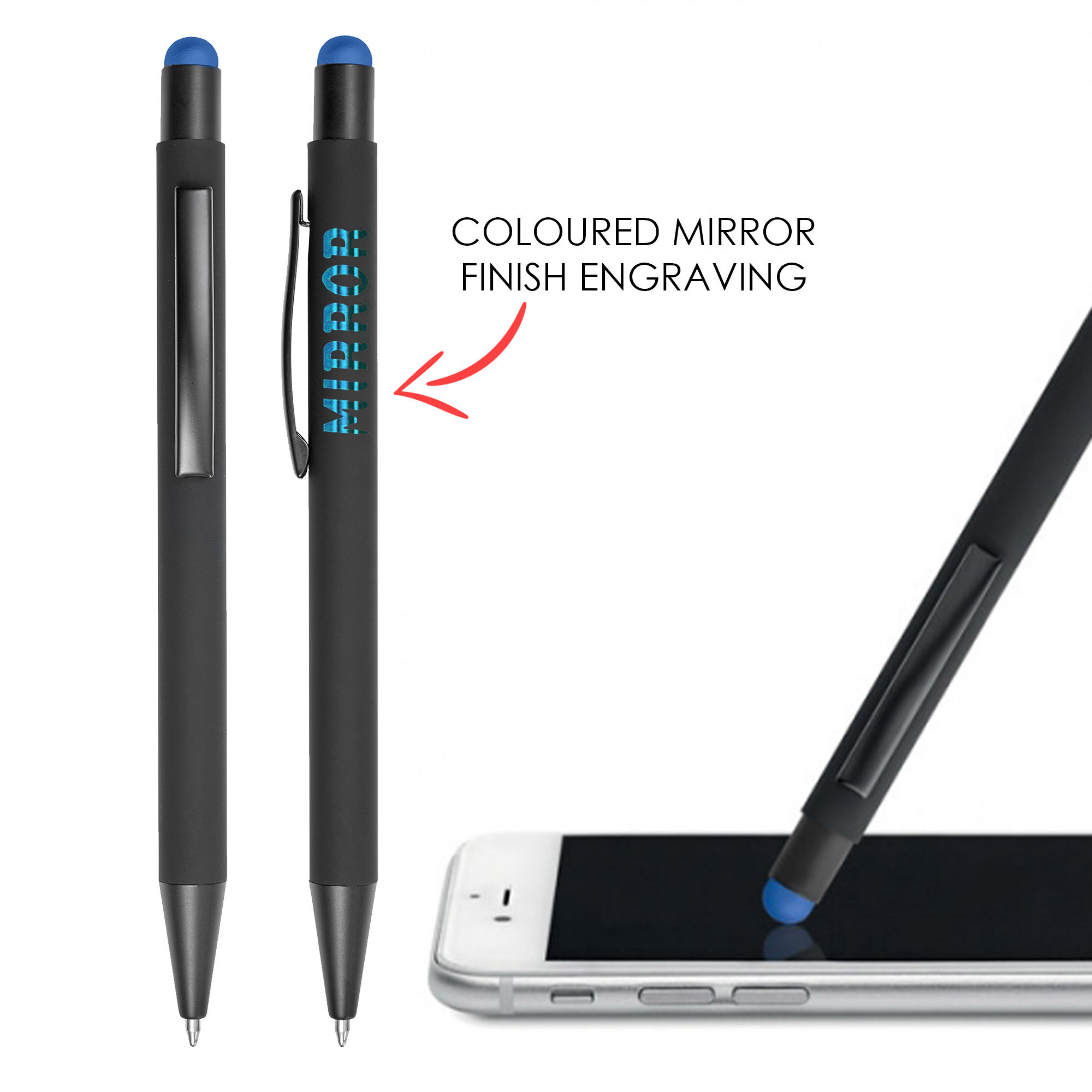 Aluminum stylus pen with black rubberized barrel, coated with mirror finishing coloured chrome which matches the colour of stylus. Click Action with plastic tip and metal clip, plastic Parker-Type German manufactured black ink refill, 1800 meters writing distance, tungsten carbide ball provides you with quality writing.