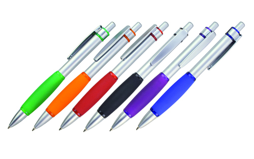 Click action pen. Matt silver barrel with Coloured soft grip. Plastic Parker-Type black ink refill