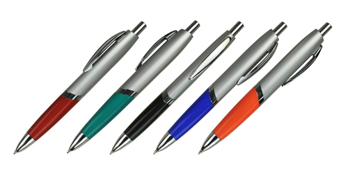 Click action pen. Opaque silver body with gloss silver fittings and Coloured grip. High quality Germany black ink refill. Tungsten carbide ball