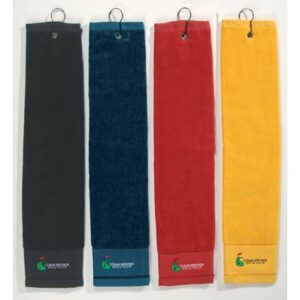 Pre-folded cotton golf towel complete with an eyelet and clip for attaching to golf bags and carts. Decoration options: Embroidery | Digital Transfer