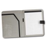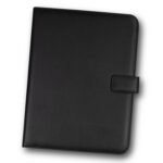 Professional PU leather portfolio with a magnetic strap closure. It comes with an A4 lined pad, one main pocket, five business card holders, and one pen loop. It is presented in an individual black cardboard sleeve.