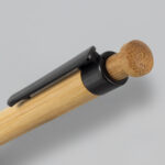 Retractable ballpoint pen with a natural bamboo barrel and black trim made from PLA plastic derived from corn starch. The pen has a black large volume refill with 1200 metres of German manufactured Dokumental ink.