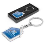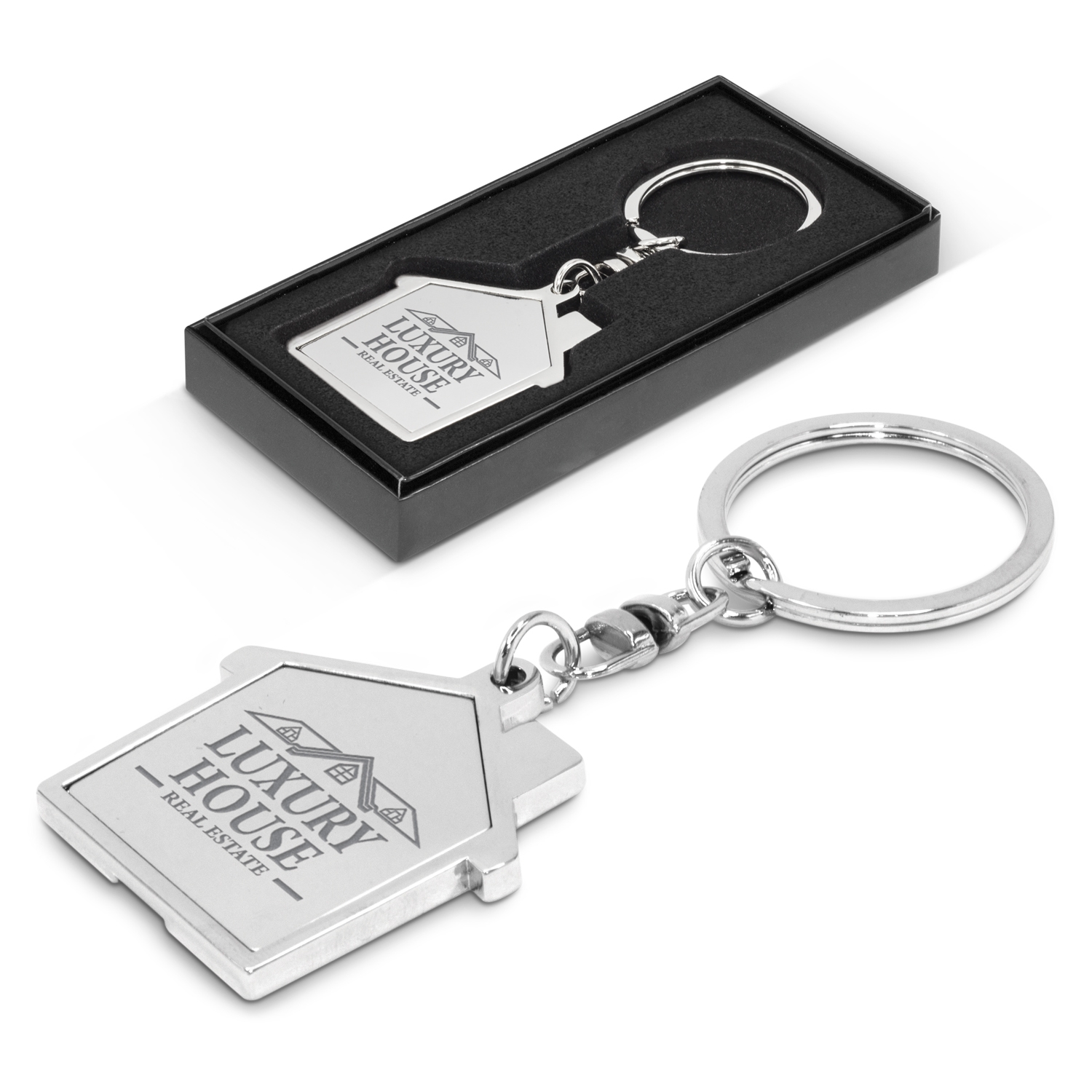 House shaped metal key ring with a plated shiny chrome finish which is nicely presented in a black gift box. It can be branded with a resin coated finish or laser engraved to a natural etch. Decoration options: Laser Engraving | Resin Coated Finish