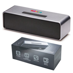 Compact 3W Bluetooth speaker with an on-trend heather style finish and built-in wireless charging capability. It will charge devices that are enabled for wireless charging simply by placing them on top of the speaker and will work with most modern phones. Icarus has 400mAh of power storage and is easily recharged from a USB port or a mains adapter. It will play for 2-3 hours and has a microphone for phone calls. The speaker is presented in a black gift box with an instruction leaflet and an 80cm Micro-B USB cable.