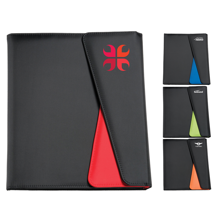 190T Polyester tri-folder with separate front pocket for document storage, internal business card pockets, pen loop and A4 lined notepad. Both compartments with magnetic closures. Supplied in polybag.