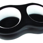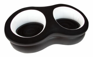 A two seater retro design inflatable chair in PVC with flocked PVC. The chair is black with white inner and comes boxed.