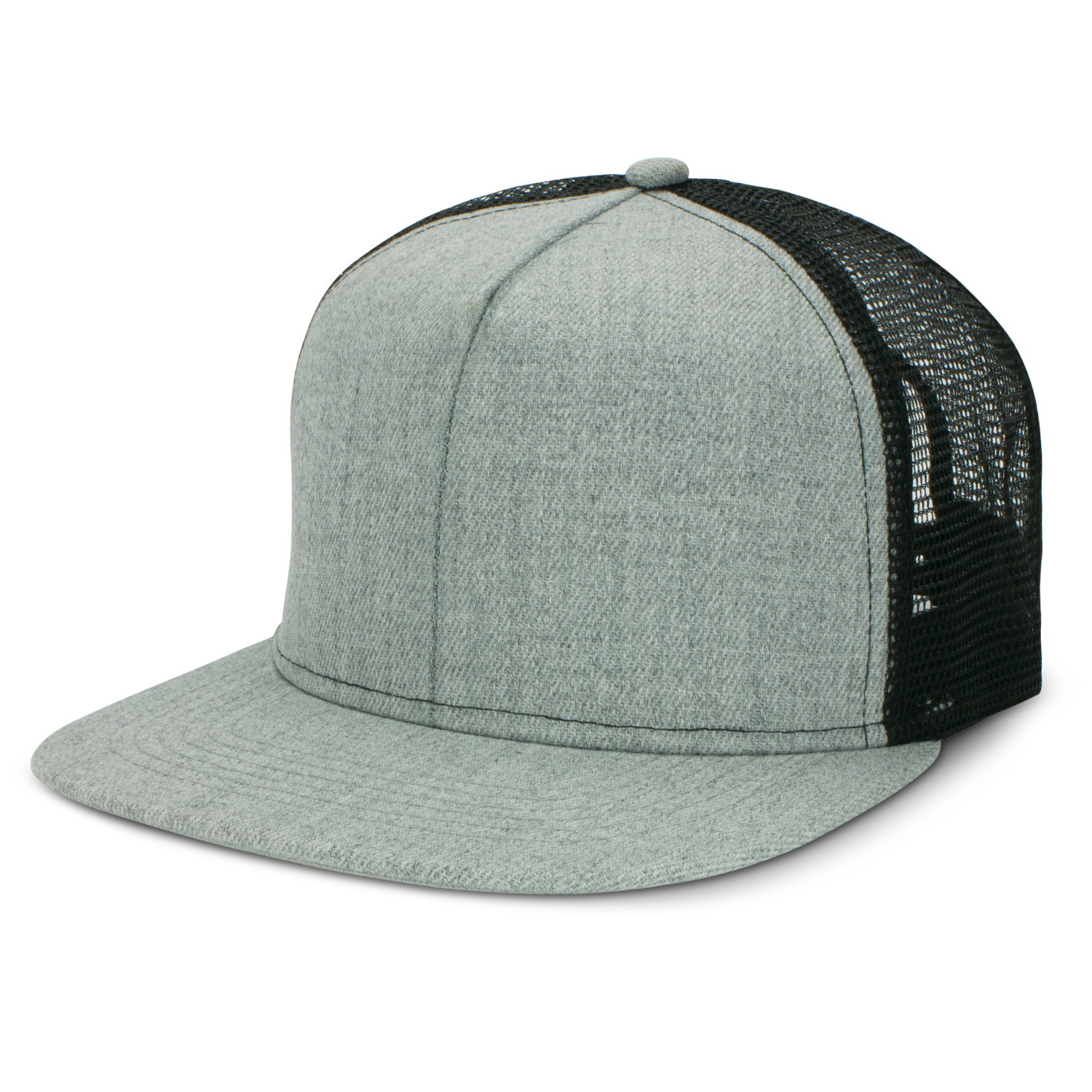 Premium structured five panel cap which is manufactured from heavy brushed cotton with a trucker style breathable mesh back. It has a trendy flat peak with a matching button. Other features include a sweat band and an adjustable snap back closure that allows one size to fit most people.