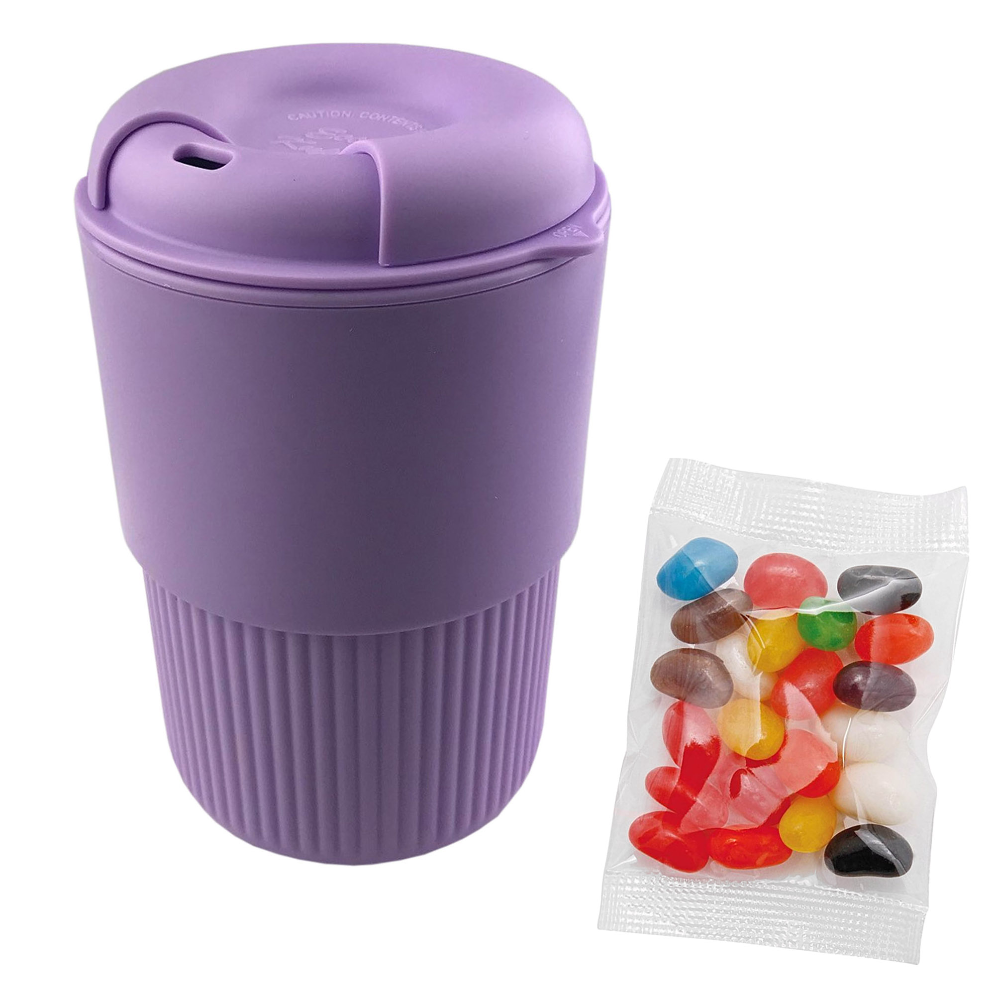 350ml BPA free double wall reusable coffee cup(EK004) comes with a bag of 50g assorted or corporate colour mini Jelly Beans(JB003), is a perfect product for eco coffee lovers, this reusable cup reduces vast amount of disposable coffee cups to protect environment. It has two sizes of drinking holes, small hole is designed for children's slow drinking, large hole can hold a straw to mind women's makeup. It is strong and durable, push splashproof silicone band lid access and leak tight. Turning lid top can cover both holes when not drinking, detachable lid parts easy for cleaning, lower part ridge surface for max comfort handling. It is dishwasher safe, but not microwave safe.