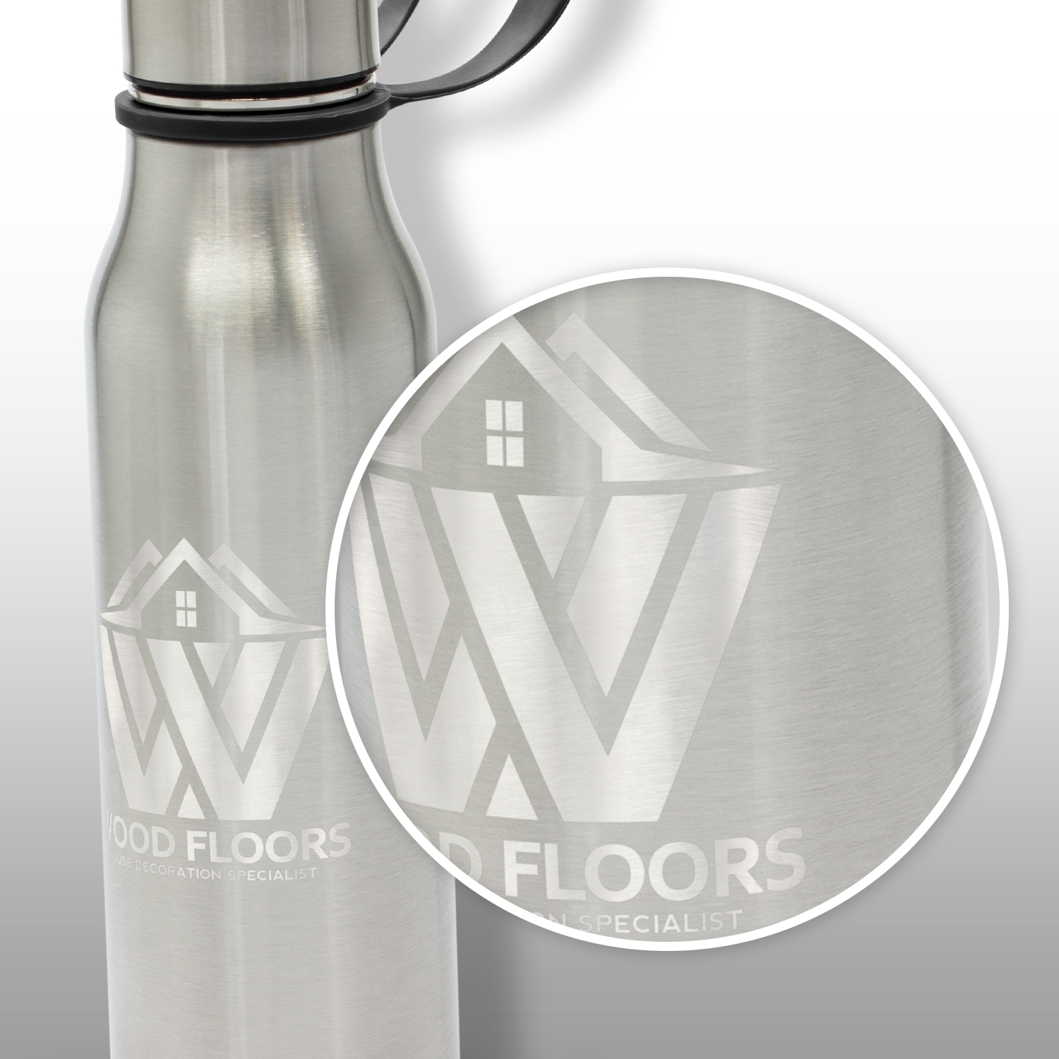 Smart 550ml double wall vacuum insulated stainless steel drink bottle with a soft silicone carry handle and a non marking EVA base. It offers exceptional performance and will keep drinks cold for 24 hours or hot for up to 12 hours. Jericho has a secure stainless steel lid and is presented in a black gift box. It laser engraves to a natural etch and handwashing is recommended. Eco SafeStainless steel does not require a plastic liner ensuring a chemical and odour free beverage. It has an indefinite life span which keeps brands in the public arena for longer and also helps to limit the use of disposable plastic bottles that can end up polluting the environment. All materials used are recyclable and BPA free.