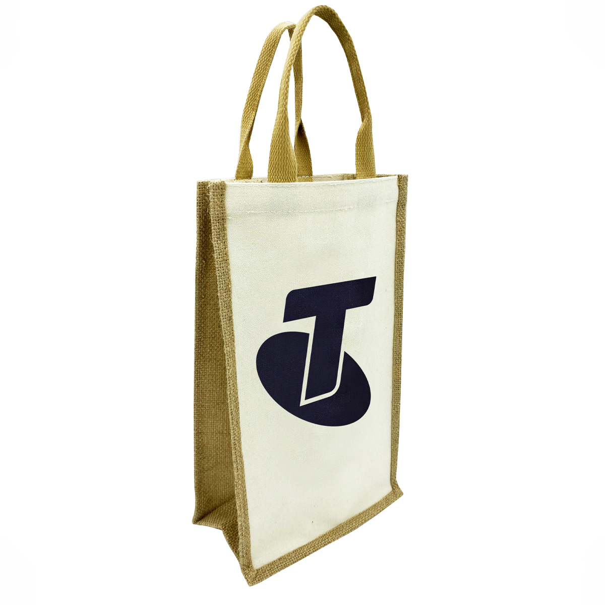 A champagne toast to the new Jute Double Wine Bag. This jute and canvas wine tote accommodates two wine bottles, cooking sauces & gourmet oil bottles, and lends an eco-edge to all gifting. This durable wine tote is an excellent giveaway for wineries, liquor stores and restaurants. Folds flat when not in use, making it the ideal space saving solution. This Jute Wine Bag is made from 300 gsm canvas and or 280 gsm jute with 80 gsm lamination. Additionally, every bag purchased, provides a donation to planting a tree, and helps to increase the green space in our world and give us fresher air to breath. The Jute Double Wine Bag is perfect for company logos and promotional messages. Contact us to know more!. We also provide branded bottle openers to put inside the bag in case one is ever forgotten!.