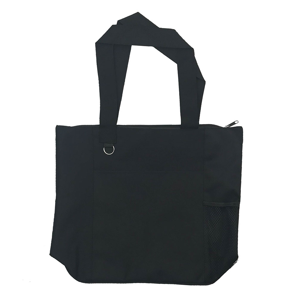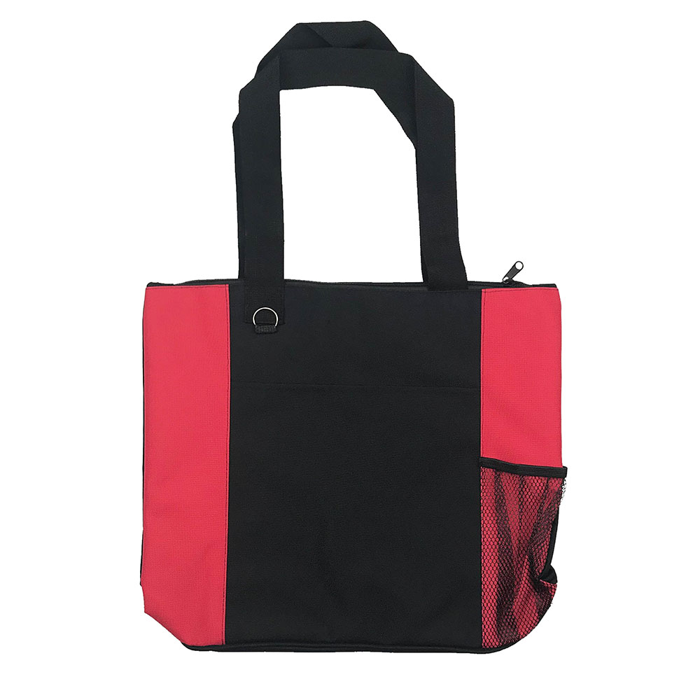 Stylish shopping tote bag made from 600D polyester. Black bag with Coloured side design . A front handy pouch for personal items. Black web handle with mesh side pocket to hold drink bottle. Top zipped closure and a key ring hoop. Shoulder handles approx. 66cm