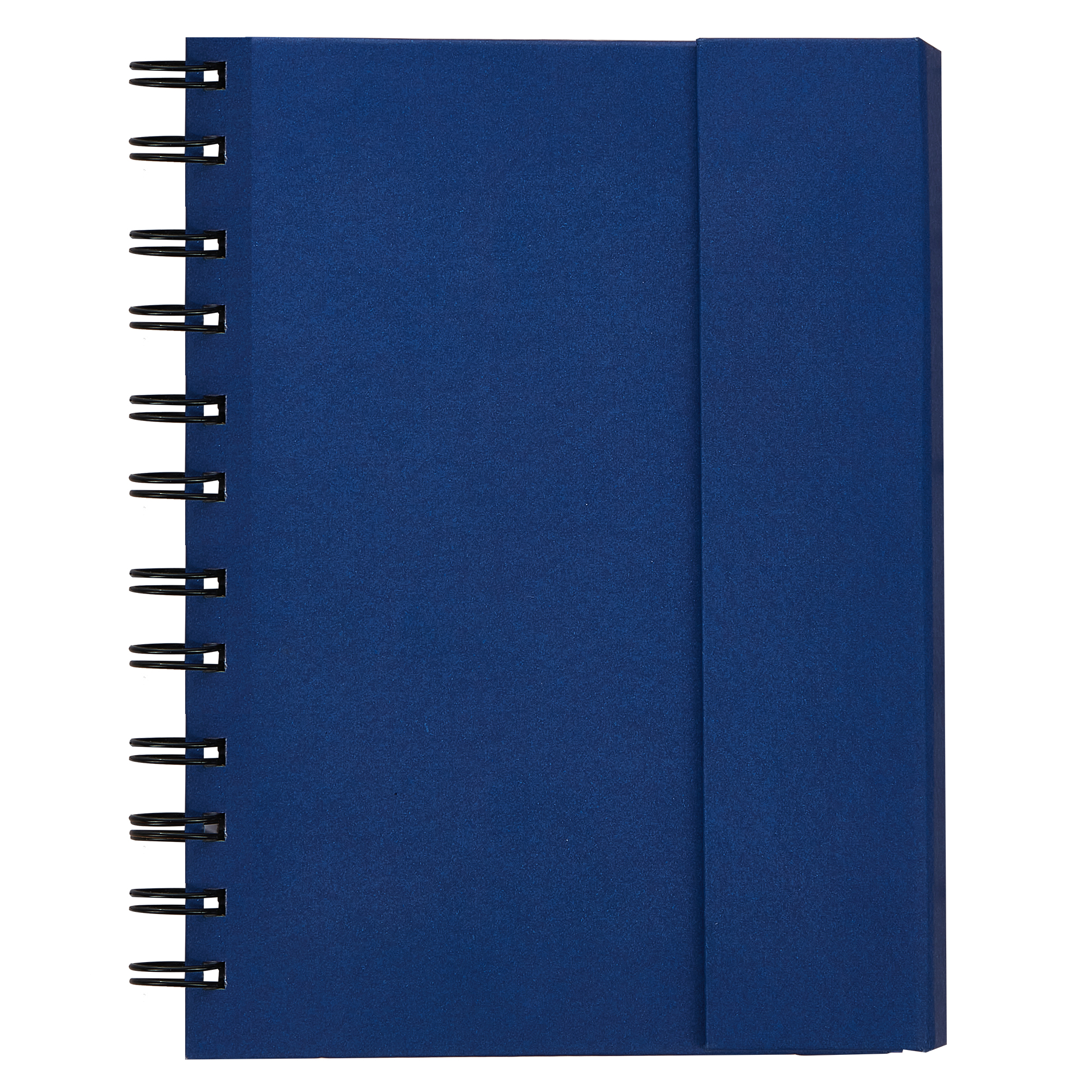 A great design of cardboard cover spiral notebook with magnetic lift off closure. It has 70 lined perforated leaves 140 pages, 5 different colour pads of paper note flags (orange, bright pink, yellow, green, baby pink), 2 x 25 sheets of repositional notepads. Elastic pen loop with recyclable cardboard pen included.