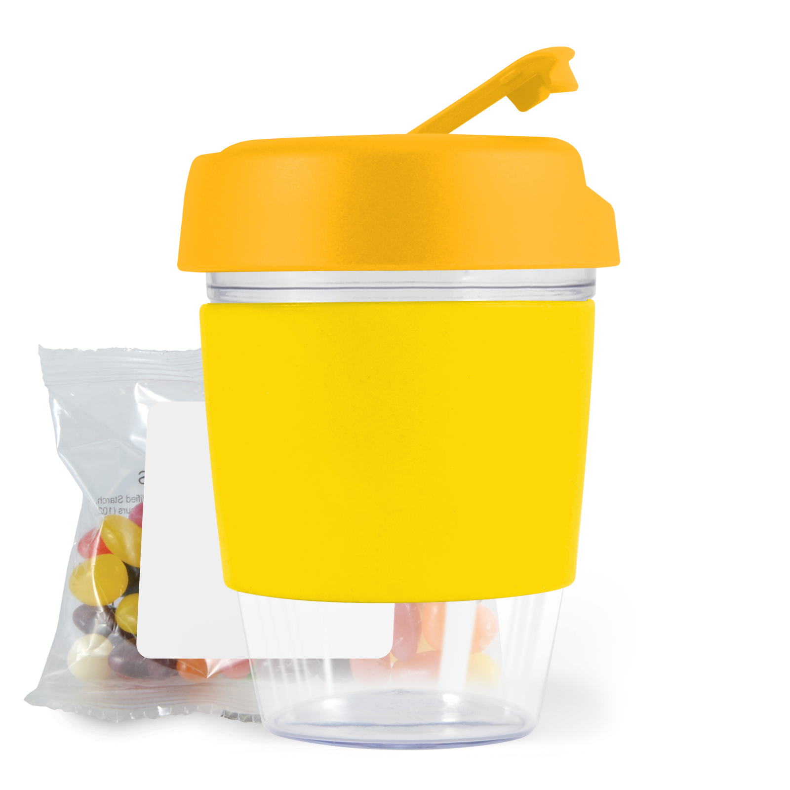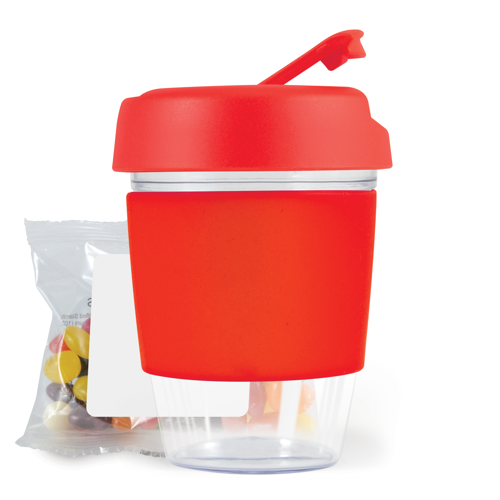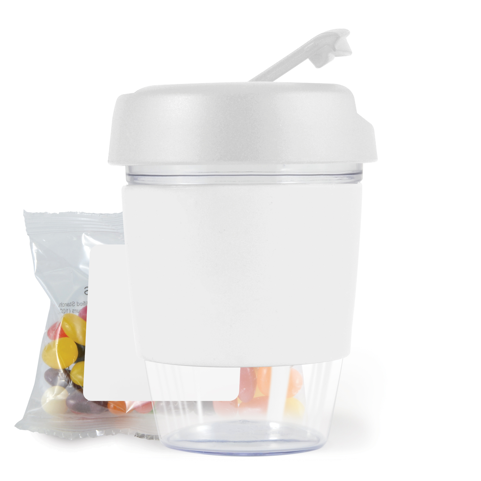 320ml clear reusable Kick coffee cup with heat resistant silicone sleeve and screw on lid. Includes 50 grams bag of jelly beans. Nominate your choice of lid and silicone sleeve colours. BPA free. For logo longevity hand washing is recommended. Eco Credentials: Reusable and sustainable through waste reduction. Includes items: Kick Cup Crystal / Silicone Band, Assorted Colour Mini Jelly Beans in 50 Gram Cello Bag.