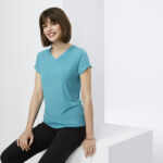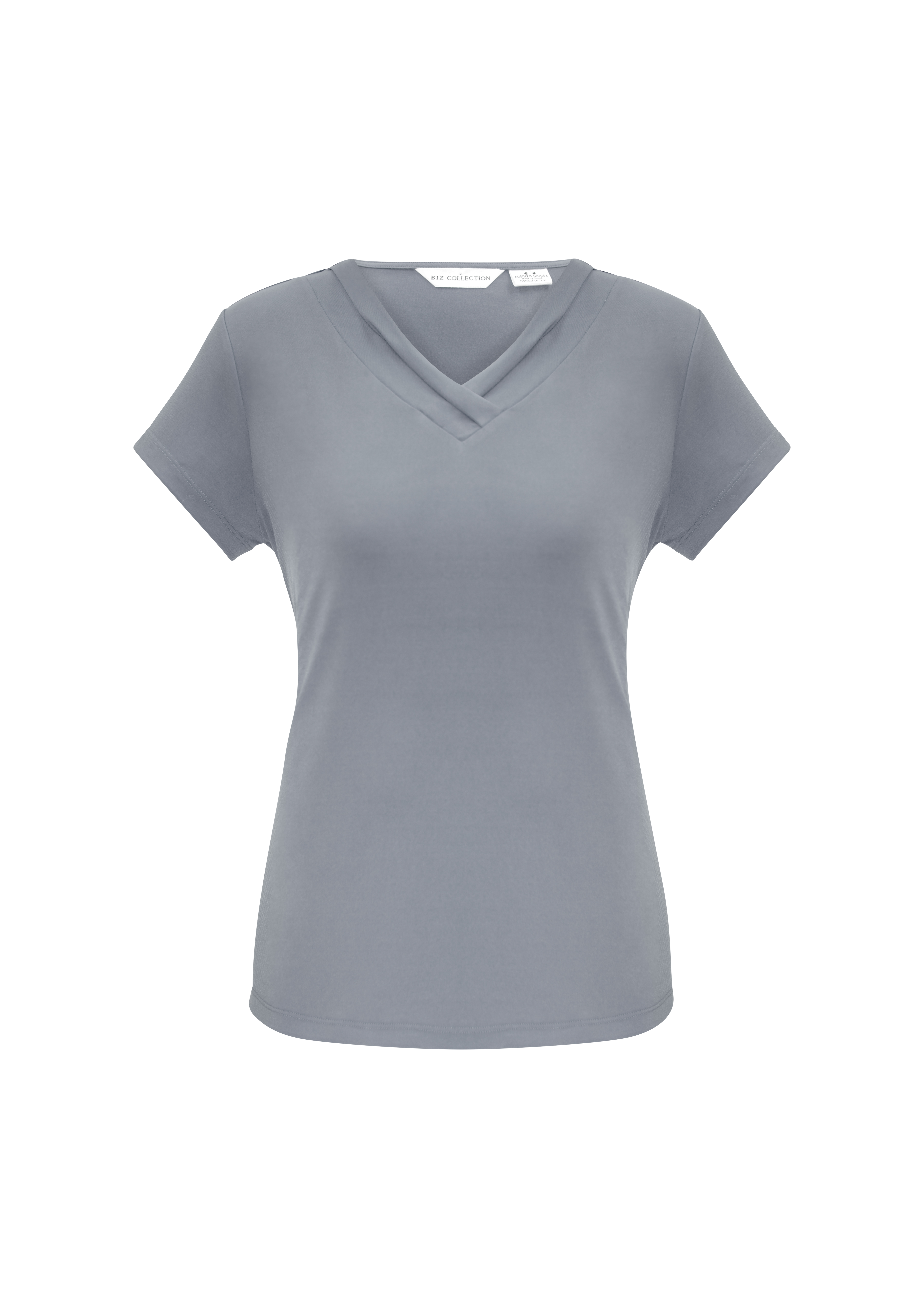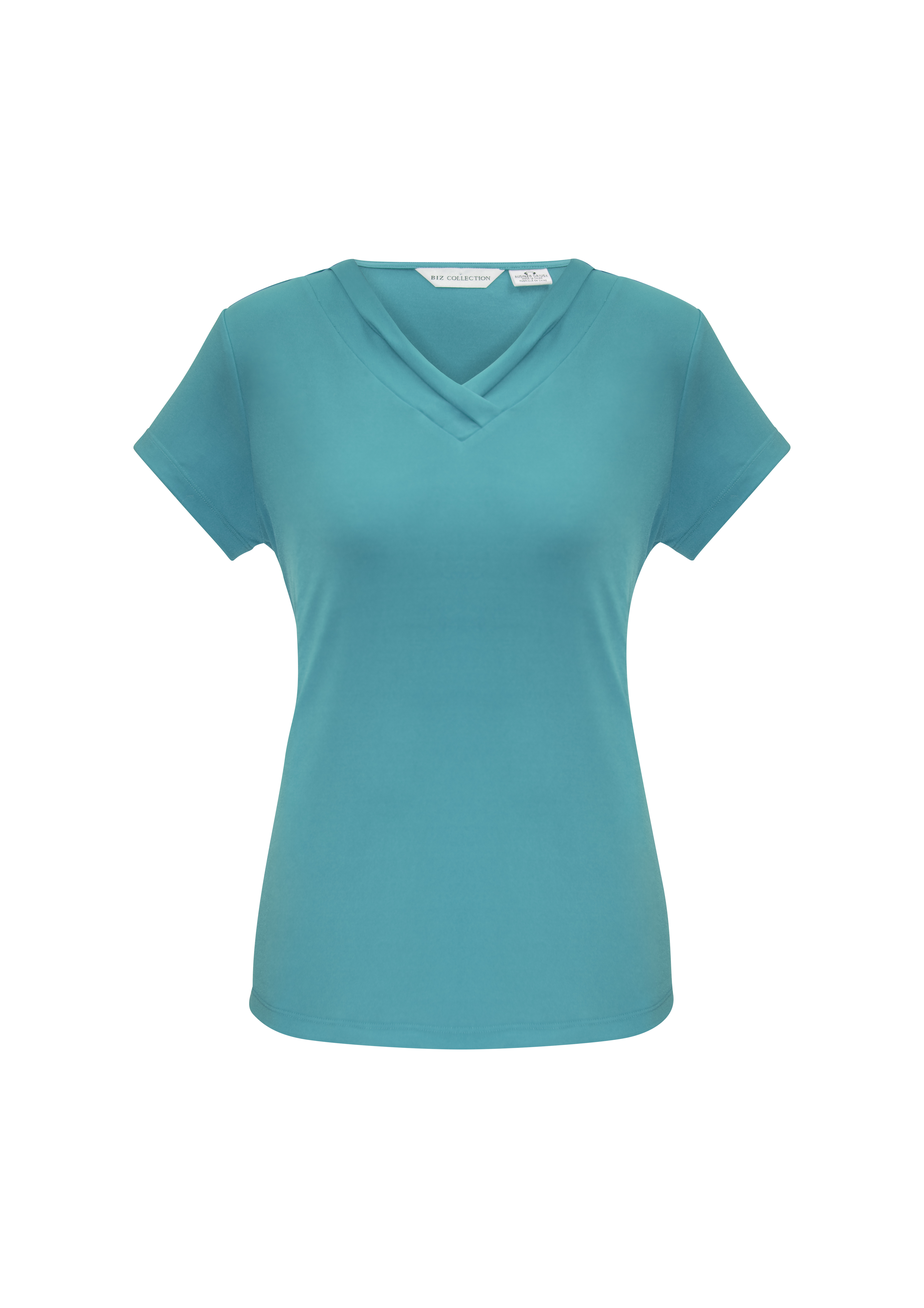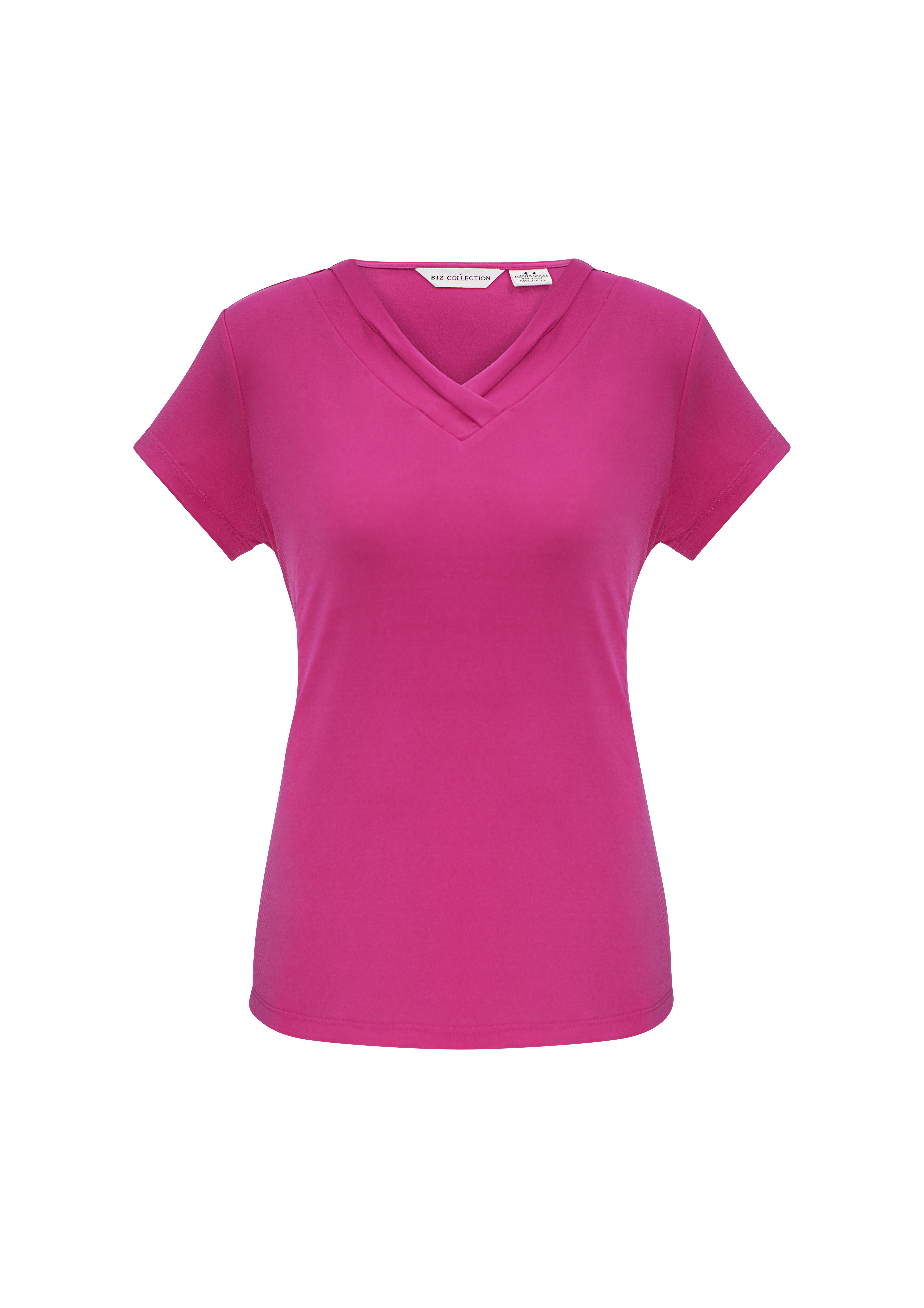 95% Polyester, 5% Elastane Jersey Knit Soft flowing easy care fabric. Features fashionable pleat fold v-neck detail. Dressed up classic t-shirt style that flatters your shape without clinging. Can be worn tucked in or out.