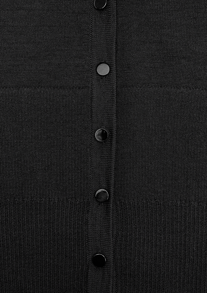 50% Pre-Shrunk Wool, 50% Acrylic - 12 Gauge Machine washable on wool setting Longer hip length with matching ribbed sleeve and hem detail, slim-line, button through placket