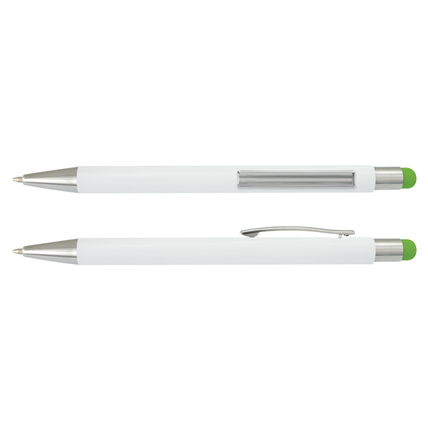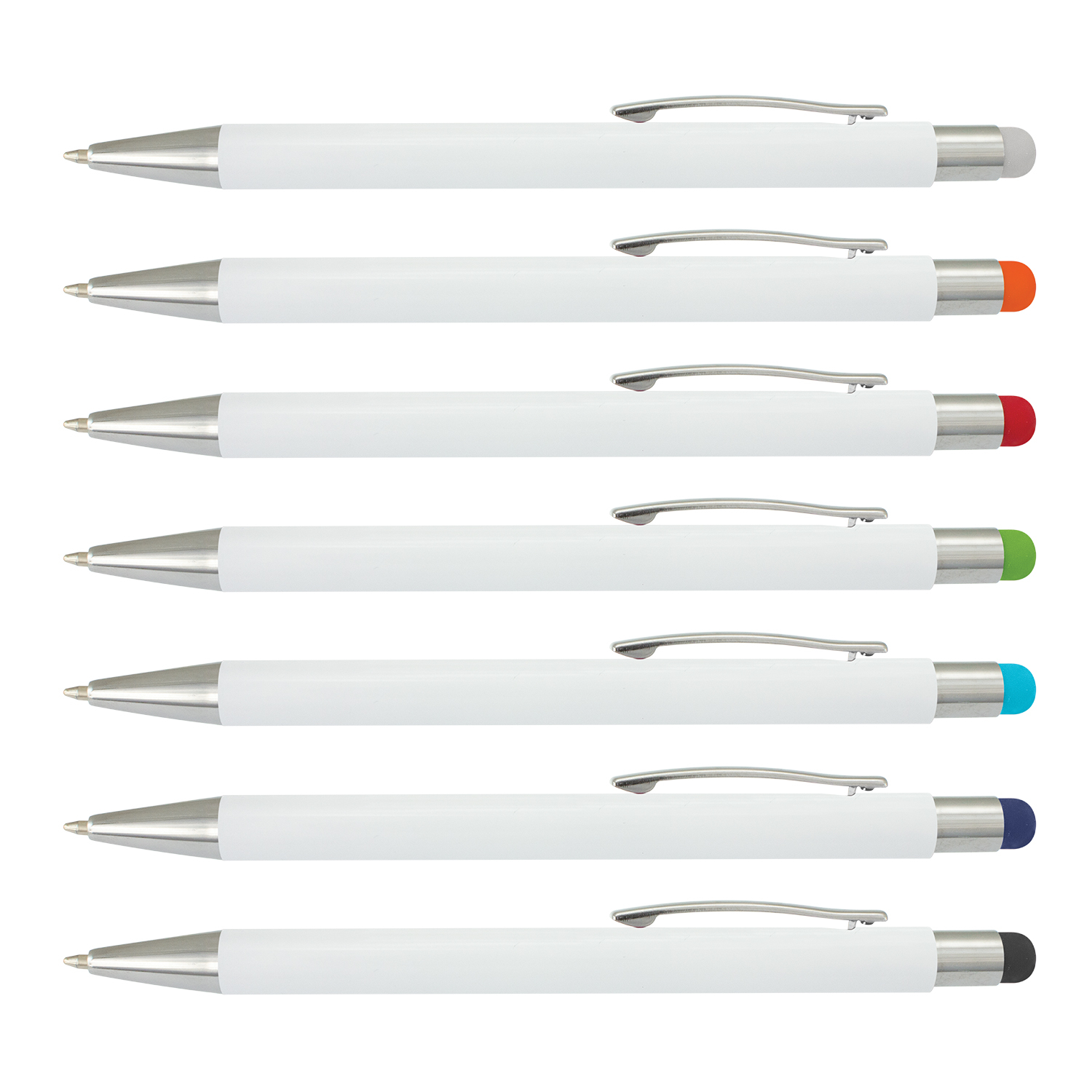Retractable aluminium ball pen with a stylus for use with touch screens and shiny chrome accents. It offers an eye-catching branding opportunity with a metallic lacquered white barrel. Lancer has a black large volume refill with 1800 metres of German manufactured Dokumental ink and a tungsten carbide ball for improved writing quality. It can be presented in an optional sleeve or a gift box.