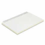 Fully customised A5 size notebook with silver wiro binding and 60 leaves (120 pages) of 70gsm cream paper which is available lined or unlined. Individual pages can be customised in one colour or full colour for an additional cost. The notebook has an 1100gsm unbleached grey cardboard back cover and a 350gsm cardboard front cover which can be branded with stunning edge-to-edge full colour print. A production lead time of 25 working days applies to this product by air freight and larger orders can be sea freighted on request to reduce the freight cost.