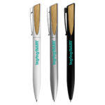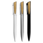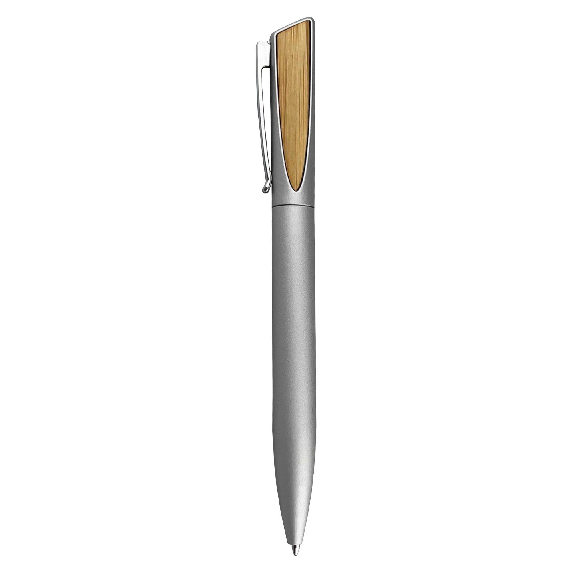 A design you will never forget - this matt finishing modern and elegant design metal pen is a unique promotional product to represent corporate logo. Twist action metal pen with a plastic top barrel and sleek natural bamboo panel and aluminum bottom barrel that can be printed or engraved with your brand logo. Supplied with metal Cross-Type German manufactured black ink refill of roughly 1200 meters writing distance.