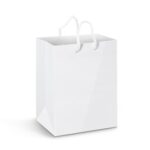 Large paper carry bag with strong woven polypropylene rope handles. It is manufactured from gloss laminated 157gsm art paper and can be branded with stunning edge-to-edge spot colour or full colour printing on all sides including the base. A production lead time of 25 working days applies to this product by air freight and larger orders can be sea freighted on request to reduce the freight cost.
