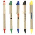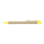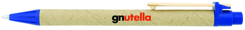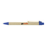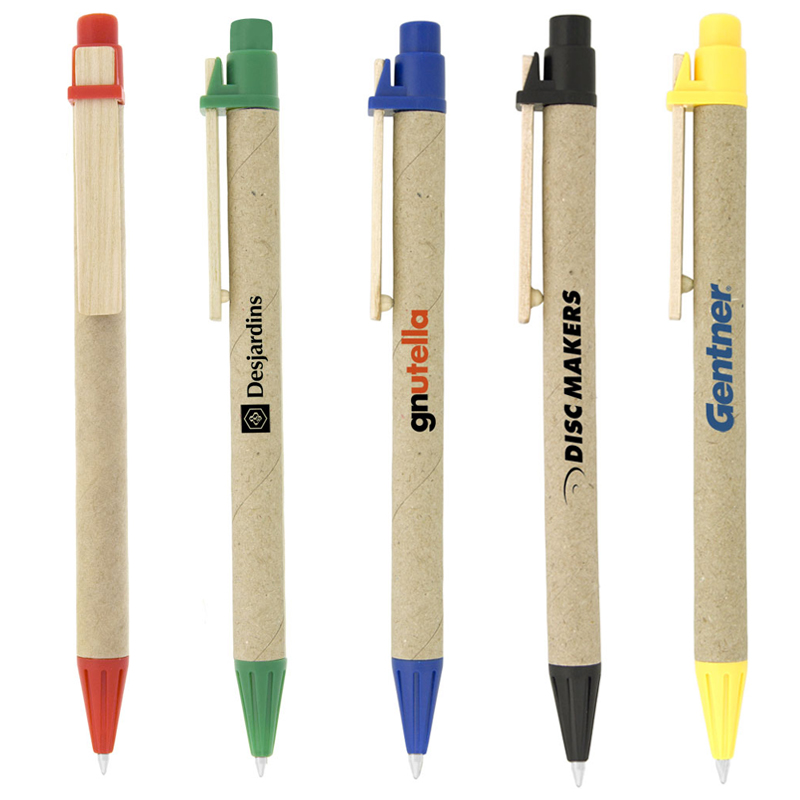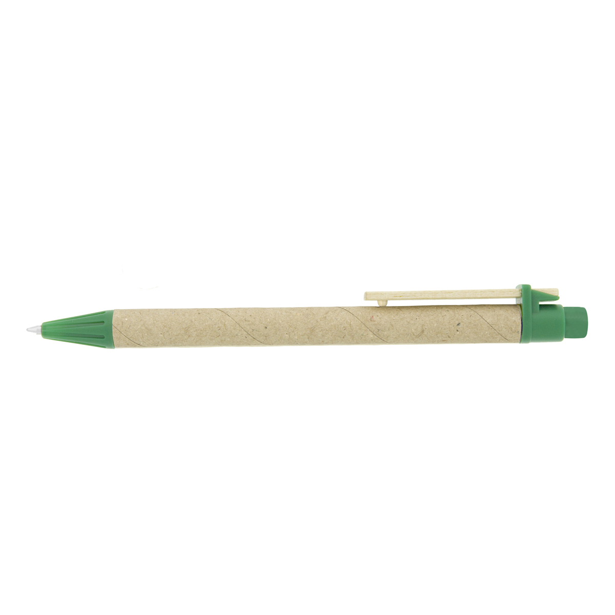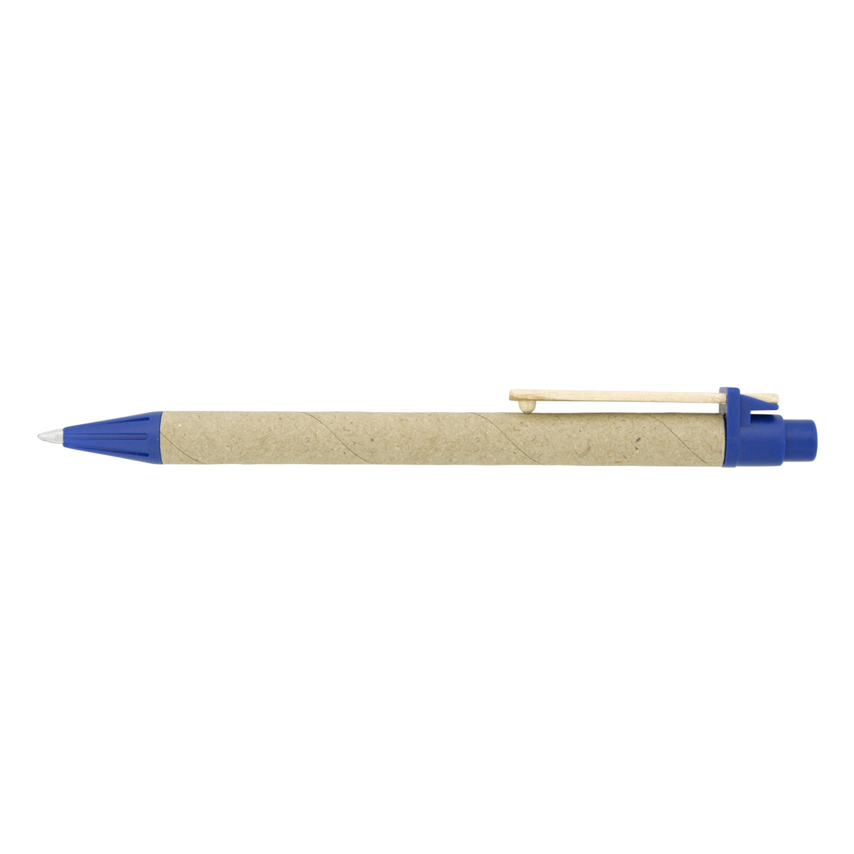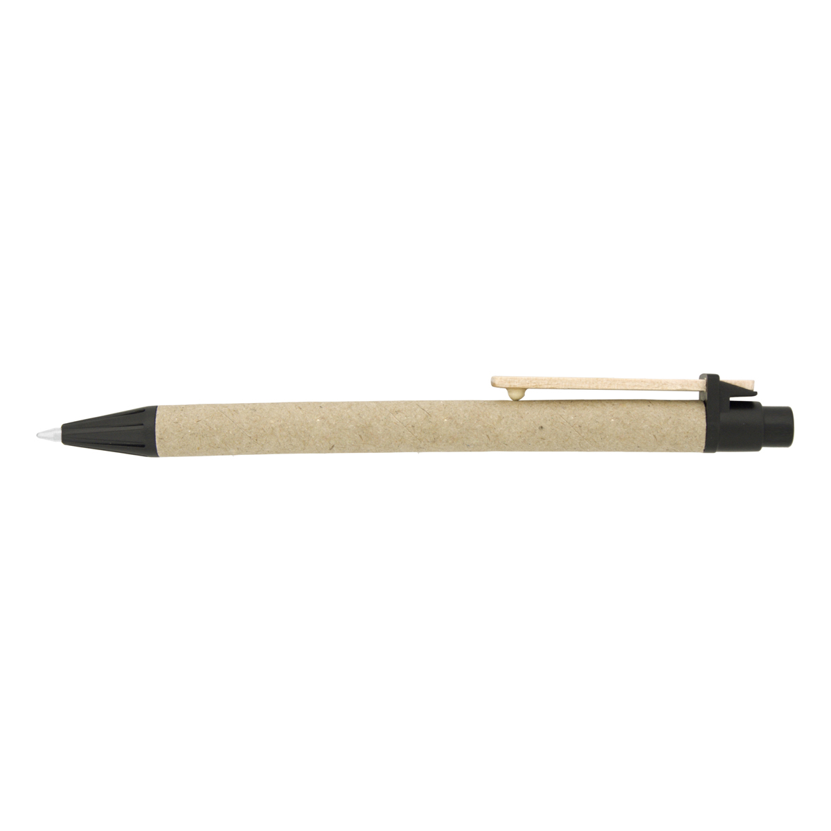 A click action ballpoint pen made of recycled paper and features a wood clip. The barrel is made of environmentally friendly biodegradable paper.