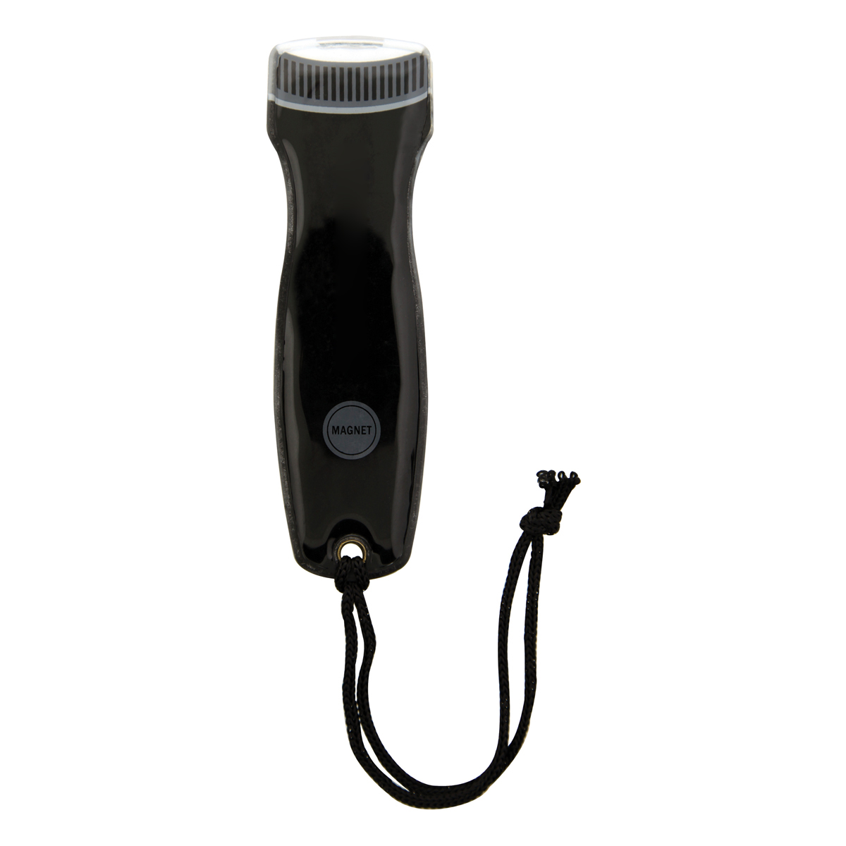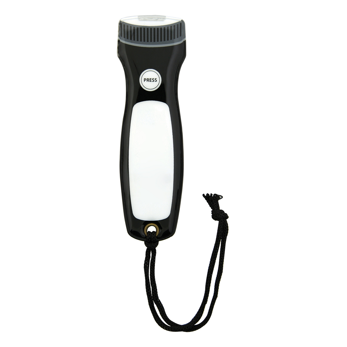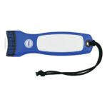 A thin vinyl covered flashlight with bright white 2-LED lights and a magnetic centre. The magnet allows the flashlight to be used or stored on a refrigerator or other metal surface. Includes wrist strap.