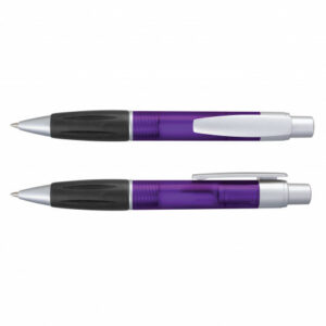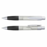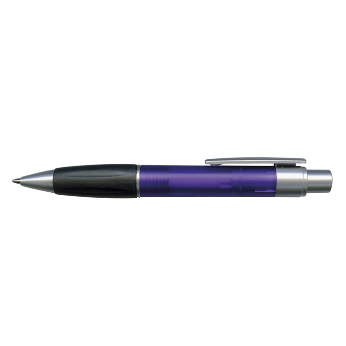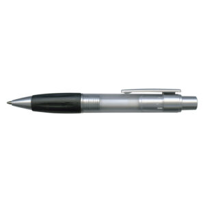 Retractable plastic ball pen with a soft rubber grip, a frosted translucent barrel and metallic Silver trim. Blue ink large volume refill with 1800 metres of German manufactured DOKUMENTAL ink and a tungsten carbide ball for improved writing quality. Black ink is available for an additional charge. Decoration options: Pad Print | Screen Print | Direct Digital