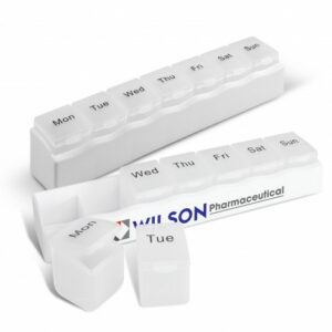 Unique medication organiser which has seven individual pill boxes which are easily removed. Each box is clearly marked with days of the week for easy medication management. Decoration options: Pad Print | Direct Digital