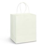 Medium size paper carry bag with strong paper rope handles. It is manufactured from 190gsm kraft paper and can be branded with stunning edge-to-edge spot colour or full colour printing on all sides including the base. A production lead time of 25 working days applies to this product by air freight and larger orders can be sea freighted on request to reduce the freight cost.