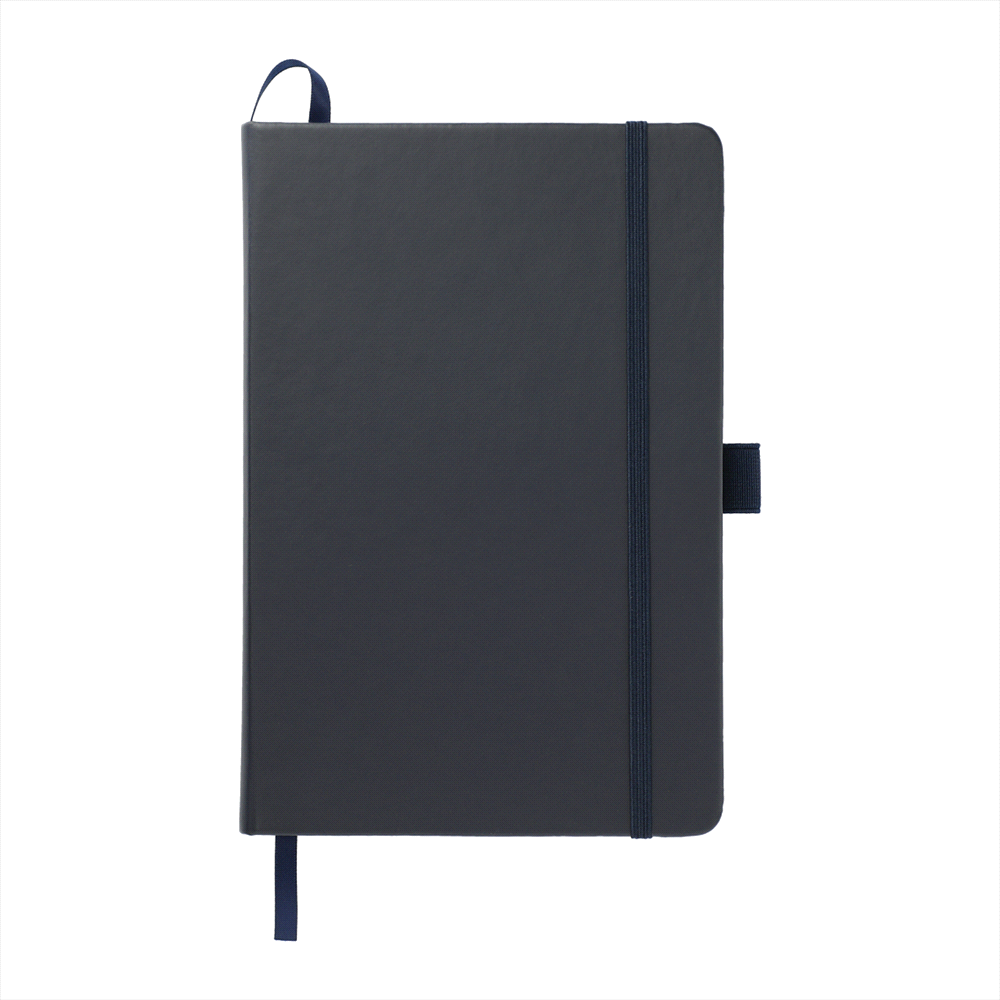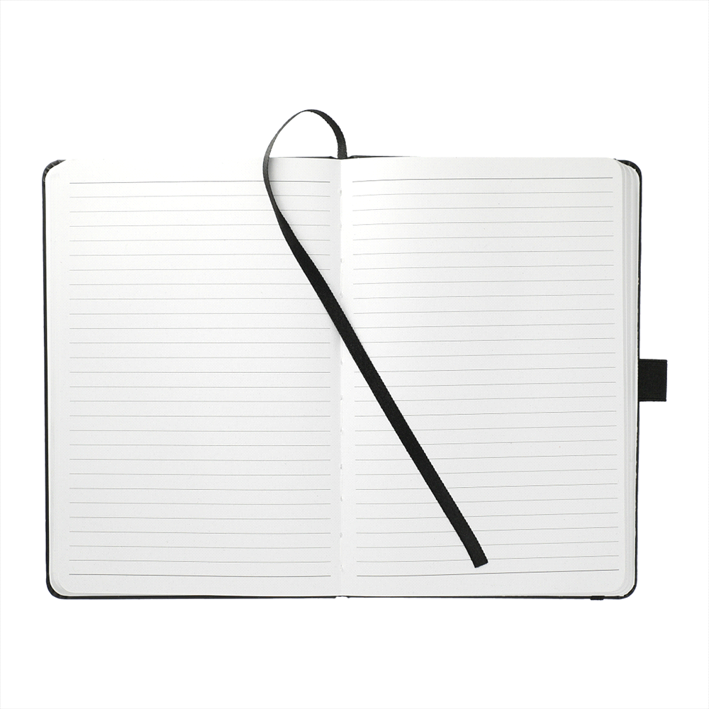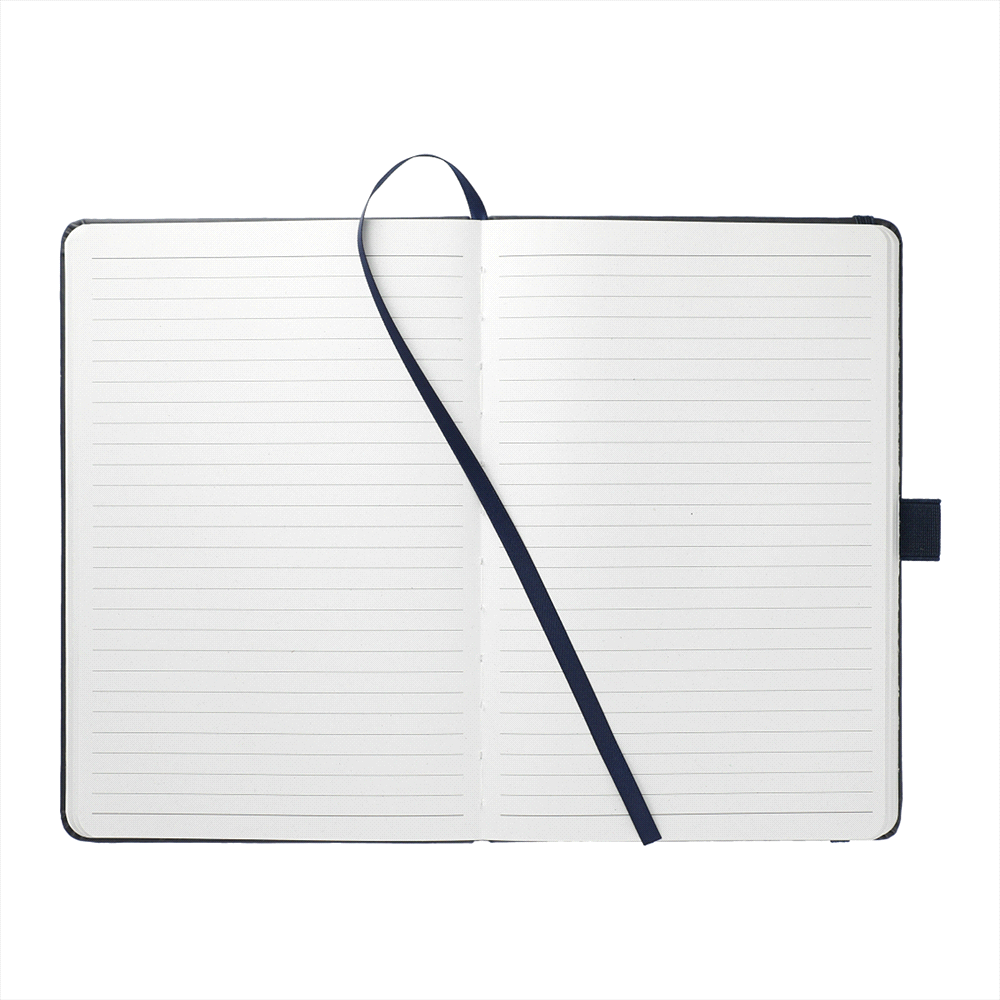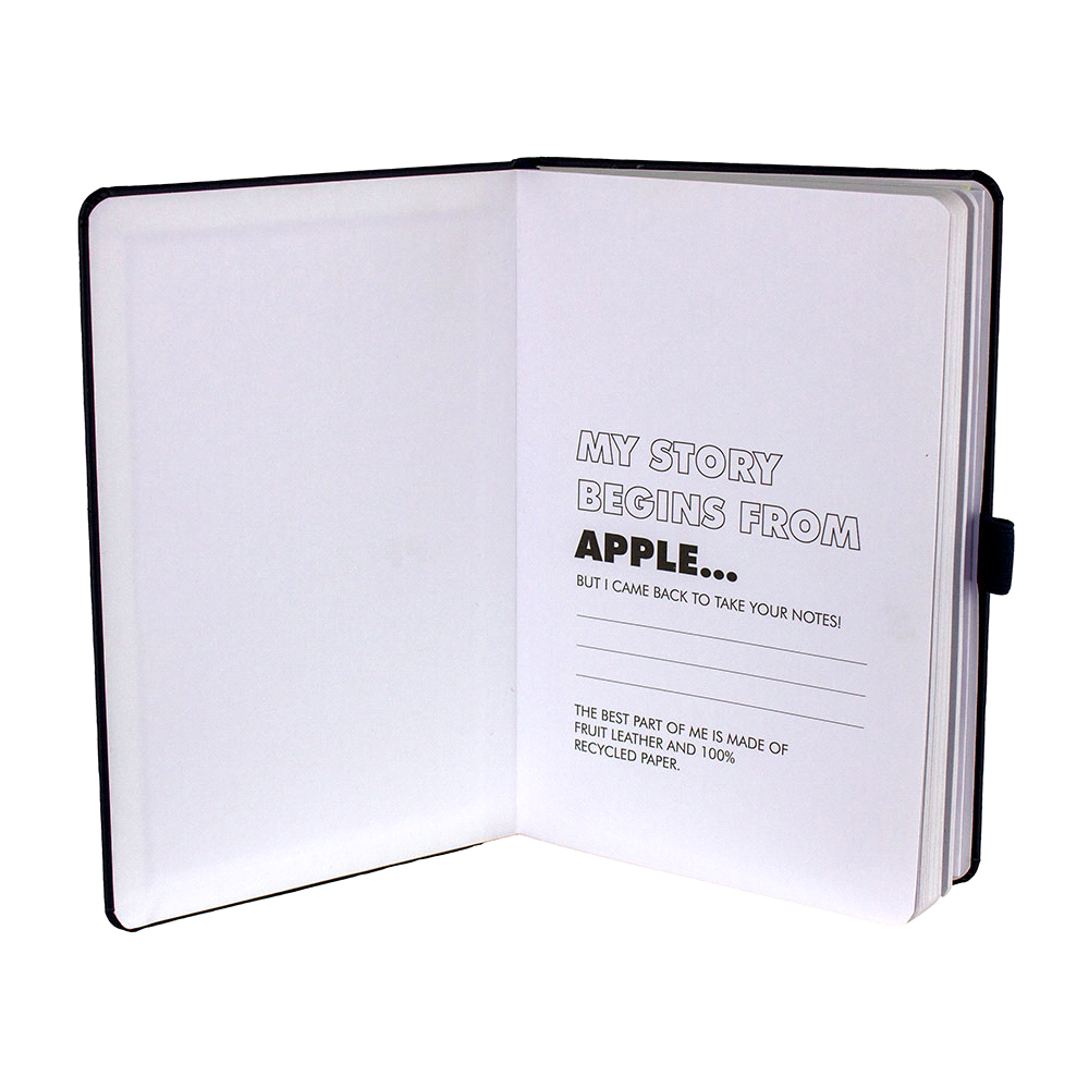 The mela recycled JournalBook ® presents a uniquely crafted hardcover, color-matching elastic closure, pen loop, and ribbon page marker, with 39% of apple components. Features 80 sheets of white lined 100% recycled paper and fruit leather, with a back document pocket.