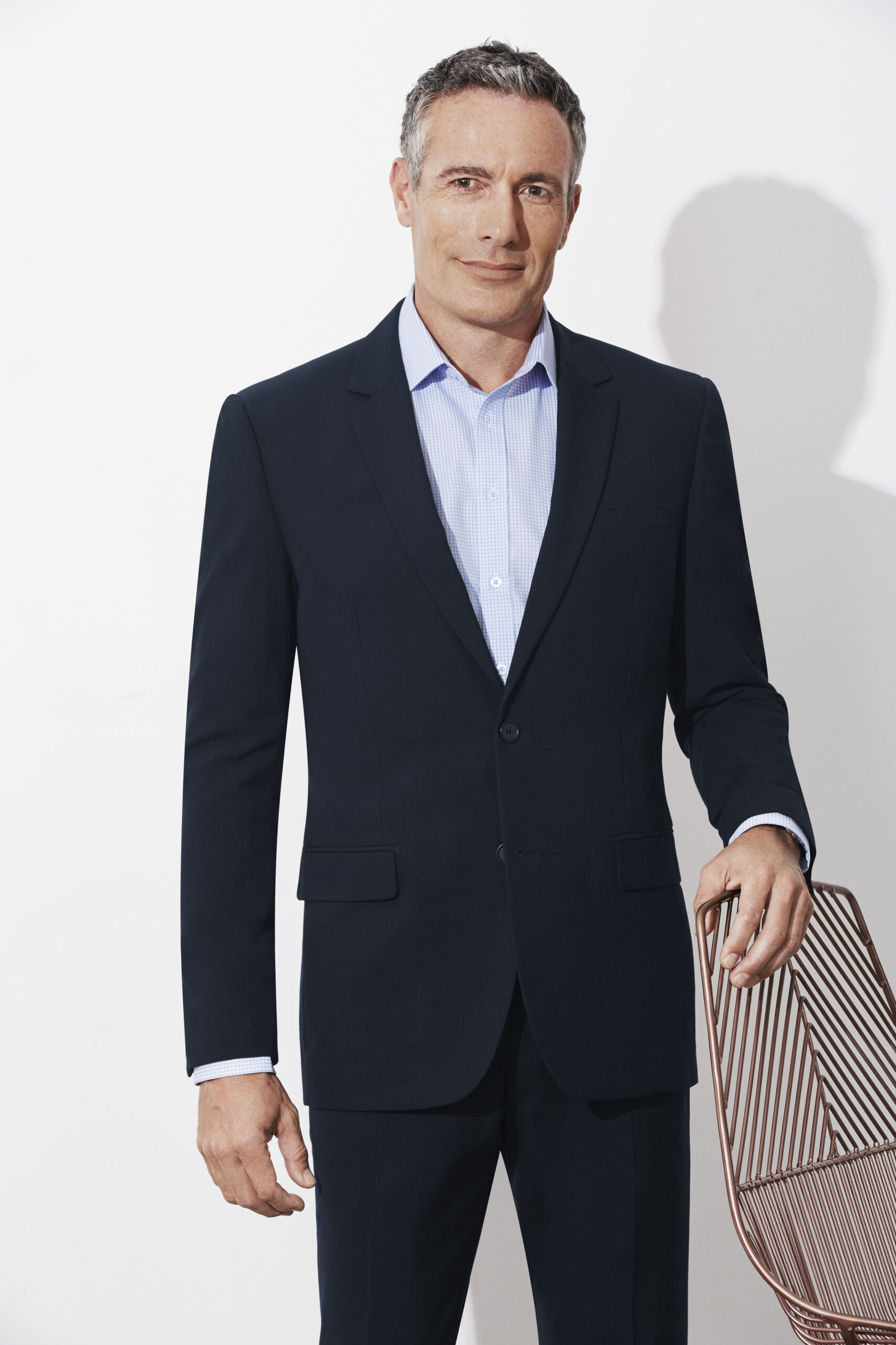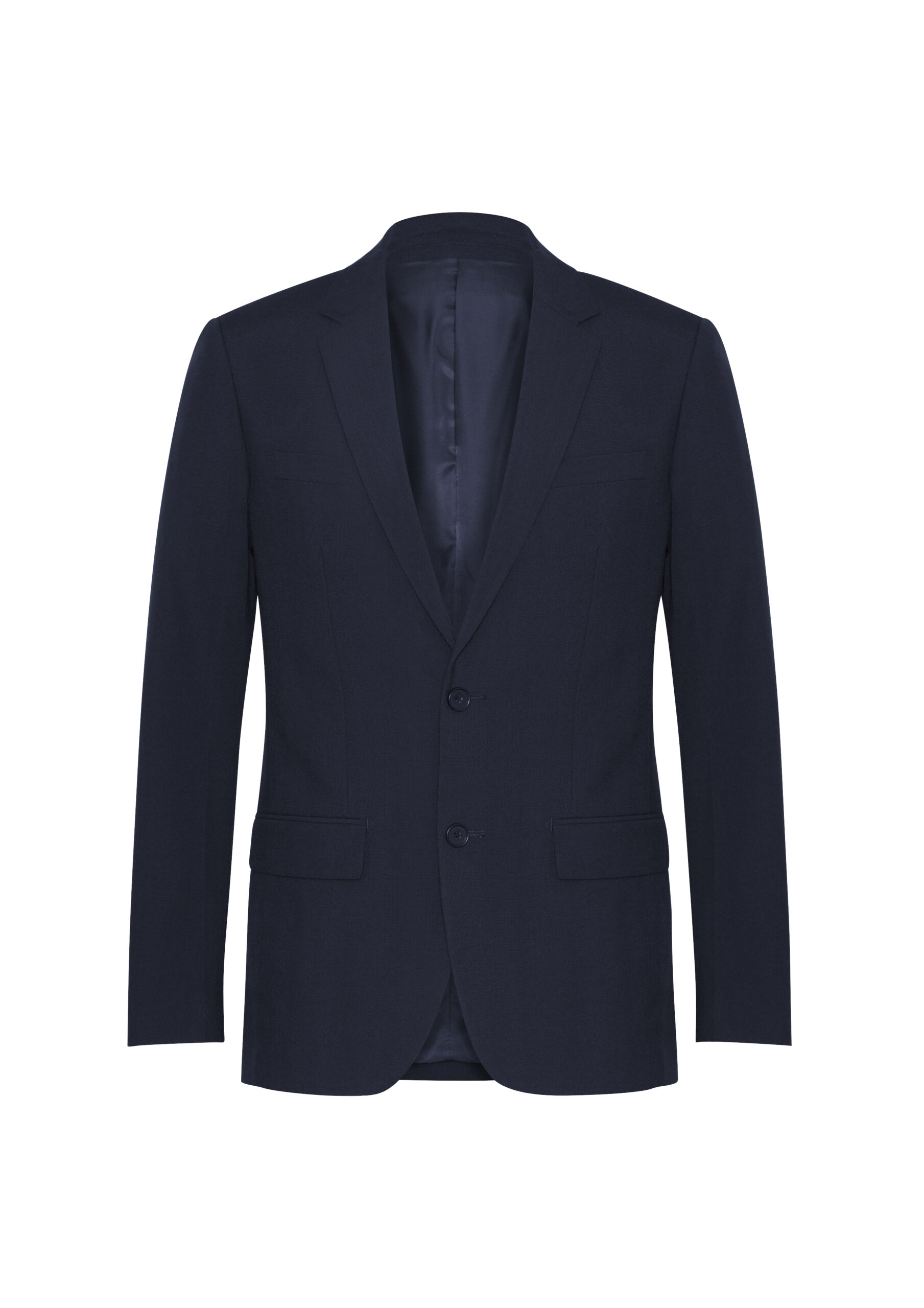 65% Polyester, 35% Viscose. Machine washable fabric and interlinings, easy care Mechanical stretch for added comfort, contemporary 2-button tailored jacket with internal welt pocket, hidden internal lining zipper for embroidery access.