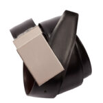 Contemporary design belt, cut to size. Silver satin finish buckle can be laser engraved, reversible buckle - belt can be worn black or brown side up. Detachable buckle allows belt to be cut to perfect length.